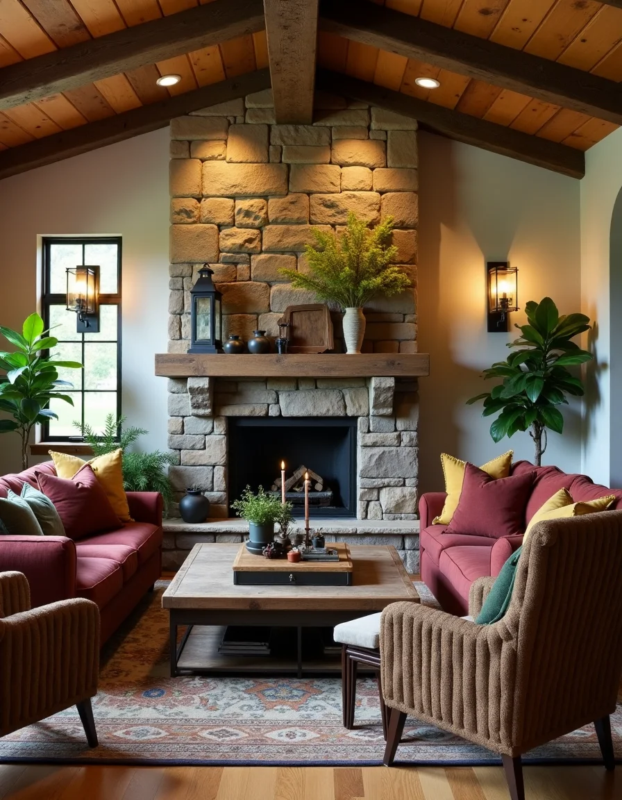 This rustic living room exudes a warm and inviting atmosphere, characterized by its use of earthy tones and rugged decor. Reclaimed wood beams stretch across the ceiling, while a large stone fireplace stands as the focal point, adorned with a hand-crafted wooden mantel that holds an assortment of vintage lanterns and seasonal decorations. A plush, oversized sectional sofa in a rich, deep burgundy fabric is placed in a U-shape around a distressed wooden coffee table, which features metal accents for an industrial touch. Flanking the seating area are two tall, woven wicker armchairs, each topped with thick, cozy throw pillows in shades of mustard yellow and forest green to accentuate the rustic palette. Soft, warm pendant lights hang low from the ceiling, casting a golden glow, while potted ferns and succulents bring life to the corners, enhancing the natural elements of the space.