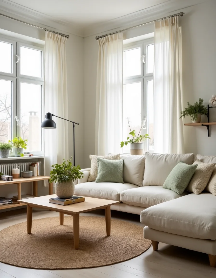 The living room embraces a serene Scandinavian style, featuring a soft color palette of pale whites, muted grays, and gentle taupes that create a calm atmosphere. A light oak coffee table sits center stage, complemented by a plush, off-white sectional couch adorned with cozy knitted throw pillows in various shades of beige and pastel green. Across from the couch, a minimalist entertainment unit made of natural wood displays a few curated books and small potted plants. Large windows allow ample daylight, dressed with sheer white curtains that flutter softly in the breeze, while a woven jute rug adds warmth underfoot, tying the entire room together with textured simplicity.