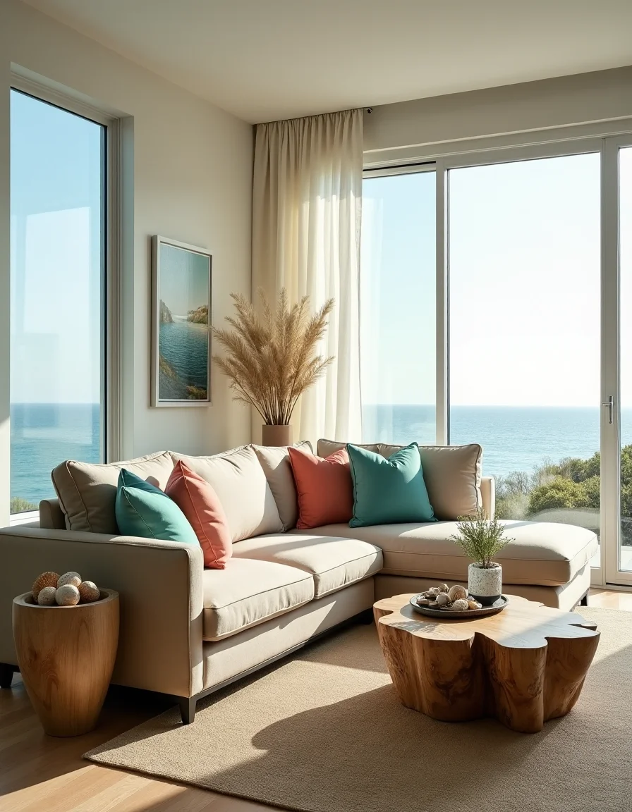 The living room exudes a refreshing seaside charm with large, floor-to-ceiling windows that allow ample natural light to pour in, revealing a breathtaking view of the ocean beyond. Soft, sheer white curtains flutter gently in the sea breeze, softening the sunlight and creating an airy atmosphere. A plush, angled sectional sofa in a muted sand color is adorned with an assortment of throw pillows in shades of aqua, coral, and cream, perfectly complementing a large, driftwood coffee table positioned in front. Nautical decorations, such as a collection of seashells in a glass vase, elegant marine-themed artwork hung on the walls, and potted coastal plants like sea oats and succulents, infuse the space with understated elegance and serenity, while a soft woven area rug ties the room together in natural tones. The ambiance is crisp yet inviting, reminiscent of a casual beach retreat where one would relax and soak in the sun.