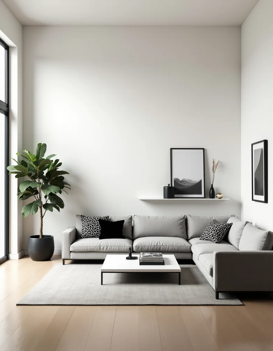 The living room exudes a serene minimalist vibe, featuring a spacious layout that emphasizes negative space. A large, soft gray sectional sofa anchors the area, adorned with a couple of monochrome black and white geometric throw pillows. To complement the seating, a sleek, low-profile white coffee table sits centrally, reflecting the purity of space around it. In one corner, a tall, slender plant in a matte black pot adds a touch of organic texture, while the clean lines of a minimalistic wall-mounted shelf host a few select art objects in monochrome tones, creating an inviting yet uncluttered visual. Natural light floods through a floor-to-ceiling window, accentuating the harmonious blend of smooth white walls and a polished light wood floor.