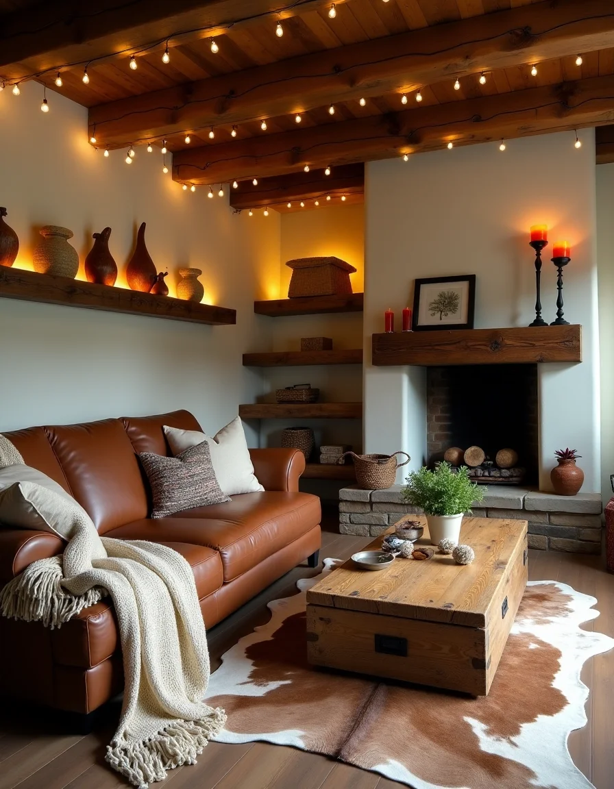 The living room is a cozy rustic retreat with warm, earthy tones dominating the color palette. A large, worn leather sectional sofa in deep brown is centered around a reclaimed wood coffee table, its surface adorned with a few artisanal ceramic coasters and a small potted succulent. To one side, an intricately woven woolen throw in shades of ivory rests casually over the arm of the sofa, while a vintage cowhide rug lies beneath, adding warmth underfoot. Richly-stained wooden beams highlight the ceiling, and an assortment of handmade wooden sculptures and woven baskets are displayed on floating shelves, nestled among soft golden-hued fairy lights that twinkle softly, casting a warm glow throughout the room. Flanking the fireplace, a pair of wrought-iron candlesticks hold vibrant orange and deep red candles, adding splashes of color and enhancing the rustic ambiance.