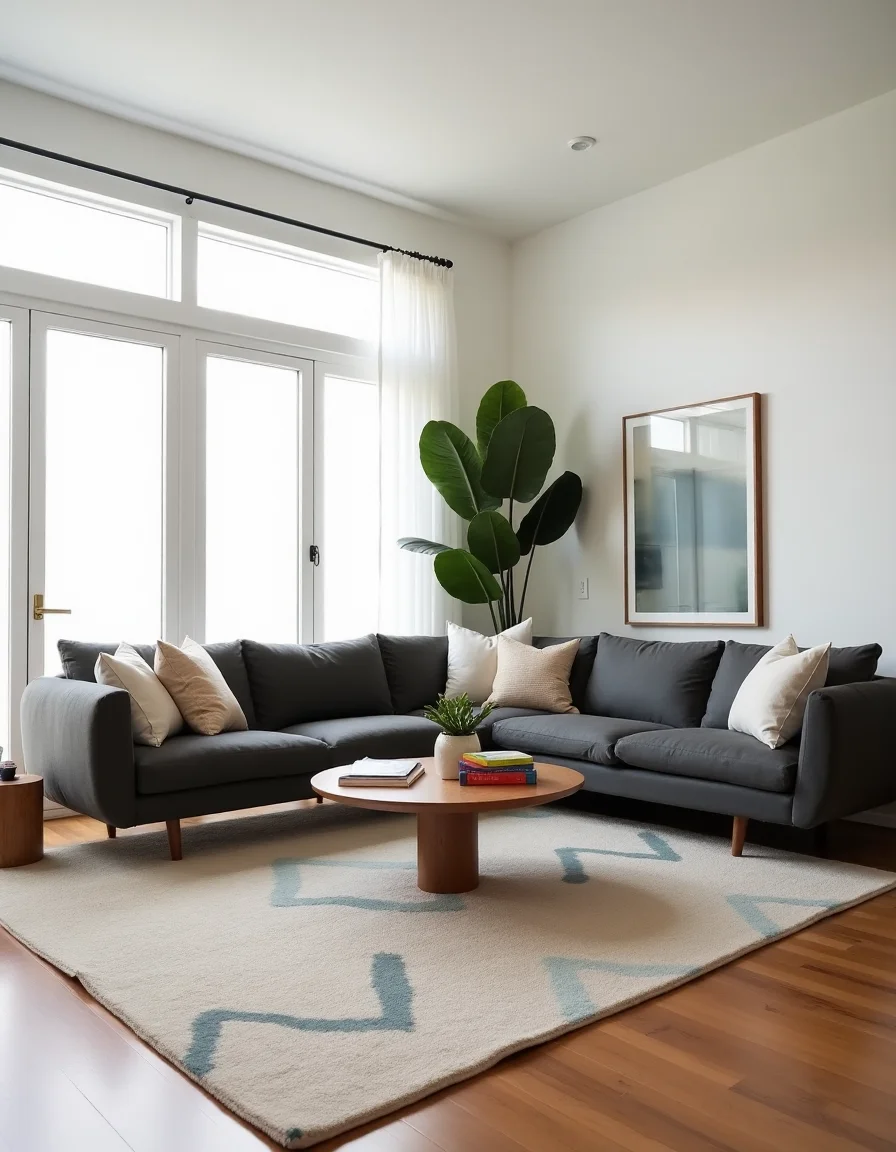 The living room exudes a modern charm, featuring an open layout that emphasizes simplicity and functionality. The hardwood floors, a warm walnut shade, contrast elegantly with sleek, white walls, creating a cozy yet sophisticated ambiance. A low-profile, charcoal gray sectional sofa is centered on a large, plush area rug with geometric patterns in muted tones of beige and soft blue. A round walnut coffee table rests in front, adorned with a few minimalist decor pieces including a succulent in a ceramic pot and a stack of colorful art books. To enhance the warmth, large windows dressed in sheer white curtains allow natural light to flood the space, while a couple of potted fiddle leaf figs positioned beside the couch bring a touch of greenery to the otherwise clean aesthetic.