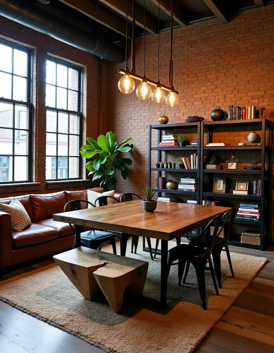 The living room features a striking industrial style, characterized by exposed burnt brick walls that add a raw and rustic charm to the space. In the center, a robust solid wooden table with a rich, dark finish is surrounded by mismatched metal chairs, enhancing the eclectic vibe. Airy, large windows framed with black steel create a bright ambiance, while industrial-style pendant lights with Edison bulbs hang above the table, casting a warm glow. A plush, distressed leather sofa in deep brown is positioned against one wall, adorned with colorful throw pillows, while a vintage metal bookshelf filled with curated books and unique decor pieces lines the opposite wall. An salvaged wood coffee table with a unique geometric design rests in front of the sofa, offering an inviting spot for drinks and conversation, complemented by a woven area rug in neutral tones that ties the room together.
