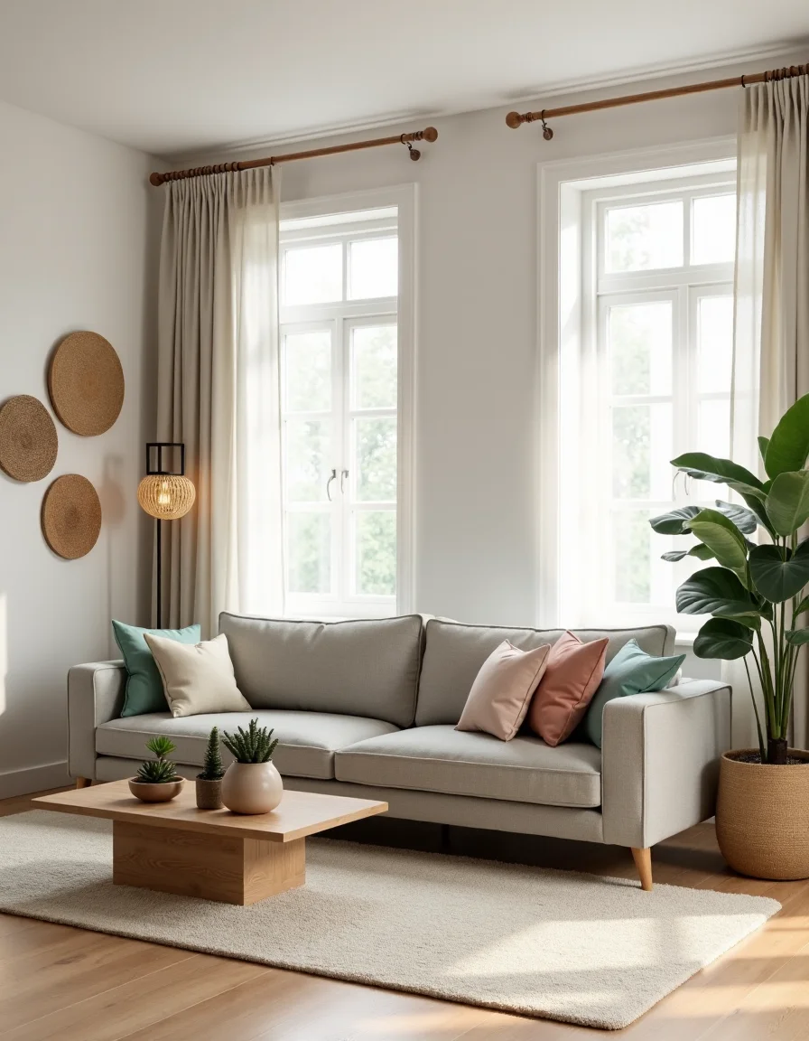 The living room embraces a cozy Scandinavian style, featuring light wood floors that create a warm and inviting atmosphere. A plush, off-white area rug grounds the space, adorned with subtle geometric patterns to enhance the modern aesthetic. A minimalist sofa in soft gray is accented with pastel-colored pillows in muted pinks and greens, while a low, rectangular coffee table made of reclaimed wood sits at the center, brimming with potted succulents for a touch of greenery. Textured wall art created from natural materials decorates the pale, matte white walls, and a simple, stylish floor lamp with a Nordic design adds a soft glow in the corner, complemented by a tall fiddle leaf fig plant. Large windows draped with sheer linen curtains allow in ample sunlight, making the room feel bright and airy, embodying the essence of Scandinavian comfort and functionality.