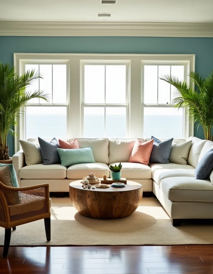 The living room embodies a serene seaside atmosphere, painted in soft shades of sandy beige and ocean blue. A large, overstuffed white sectional couch is positioned in the center, adorned with an array of textured throw pillows in varying shades of aqua and coral, inviting relaxation. A driftwood coffee table rests at the center, embellished with nautical-inspired coasters and seashells collected from local beaches, while a light cream area rug anchors the space beneath. To the sides, wicker accent chairs with soft, navy and white striped cushions frame the seating area and are placed beside tall potted palms that mimic the coastal feel, enhancing the inviting, casual decor with a touch of nature.