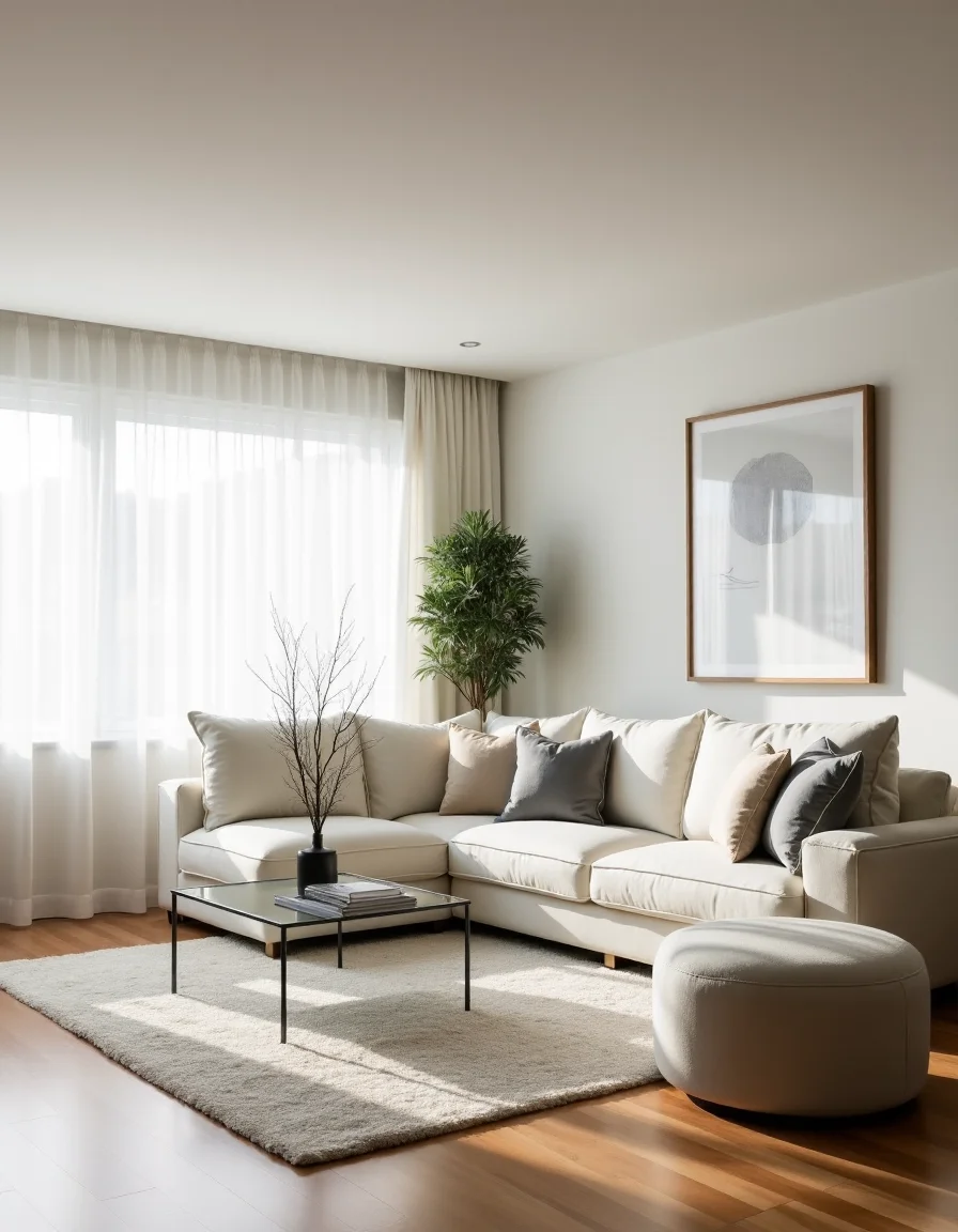 The living room embraces a minimalist aesthetic, characterized by an open layout with an abundance of negative space that fosters a sense of tranquility. A low-profile white sectional sofa is positioned in the center, adorned with a few muted gray and beige throw pillows to promote comfort without clutter. A glass coffee table with sleek metallic legs sits elegantly in front of the sofa, reflecting light and preventing any visual heaviness in the design. To enhance the ambiance, a single tall, indoor plant adds a pop of greenery in a simple ceramic pot, while a monochromatic abstract artwork hangs on the wall, completing the serene environment. Soft natural light filters in through sheer curtains, casting a gentle glow across the polished hardwood floors, contributing to the overall feeling of spaciousness and simplicity in the room.