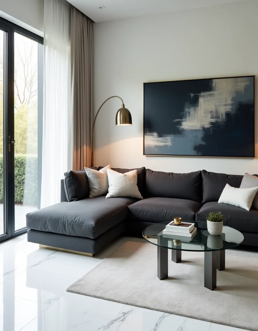 The living room boasts a sleek modern design characterized by a glossy white marble floor that reflects natural light cascading through large floor-to-ceiling windows. At the center, an oversized charcoal gray sectional sofa with clean lines and minimalist design is adorned with various textured throw pillows in soft whites and muted grays for added comfort. In front of the sofa sits a geometric glass coffee table, showcasing a few carefully arranged coffee table books and a small golden succulent planter. A large abstract painting in shades of navy and silver hangs above the sofa, anchoring the space and adding a pop of color to the simple palette. Framed by elegant sheer drapes, the room is completed with a brushed steel floor lamp that elegantly arcs over the seating area, providing soft ambient light and enhancing the modern chic aesthetic.