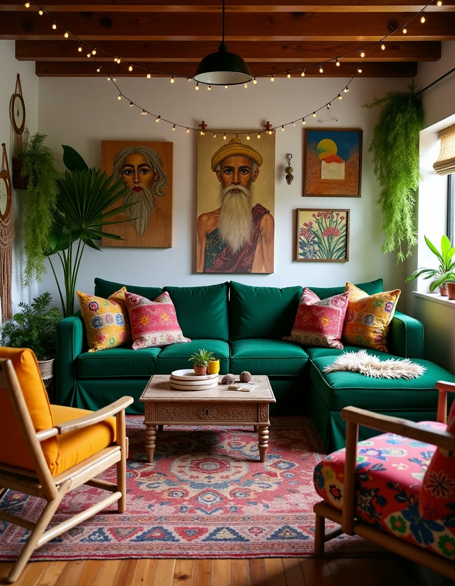 The living room embraces a vibrant bohemian style, showcasing a rich tapestry of colors and textures that invite creativity and relaxation. A large, deep green velvet sectional sofa is placed centrally, adorned with an array of colorful, patterned throw pillows in varying shapes and sizes that reflect bold tribal and floral motifs. An eclectic mix of vintage wooden furniture, including a weathered coffee table with intricate carvings and a mismatched set of armchairs—one upholstered in a bright orange fabric and the other in a patchwork of fabrics—surrounds the seating area. The walls are alive with an assortment of framed eclectic paintings, macramé wall hangings, and dreamcatchers, complemented by lush green plants cascading from shelves and corners. A handwoven area rug in warm earthy tones anchors the space while subtle twinkling fairy lights strung across the ceiling enhance the cozy, inviting ambiance.