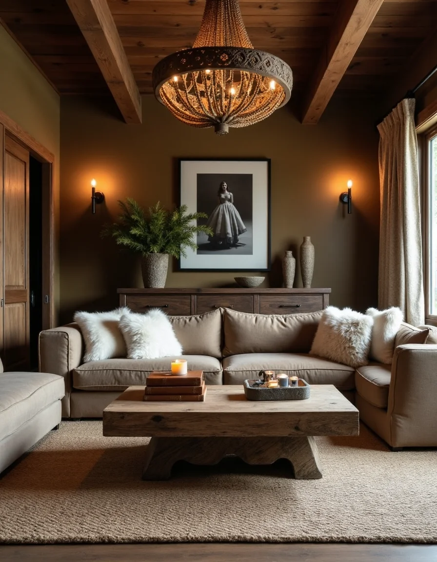 The living room exudes a warm rustic charm with its deep earthy color palette and natural textures. A large, weathered wood coffee table sits at the center of the space, flanked by a pair of plush, oversized sofas upholstered in a rich taupe wool, adorned with cozy fur throw pillows scattered across them. An intricately woven braided jute area rug grounds the seating area, while a stack of vintage leather-bound books rests atop the table, alongside a flickering candle nestled in a wrought iron holder. Soft, ambient lighting emanates from an elegant chandelier made of driftwood and glass, complemented by strategically placed wall sconces that cast a soft glow, enhancing the warm wood accents seen throughout, from the reclaimed barn wood paneling to the rustic console table adorned with potted greenery and framed black-and-white photography.