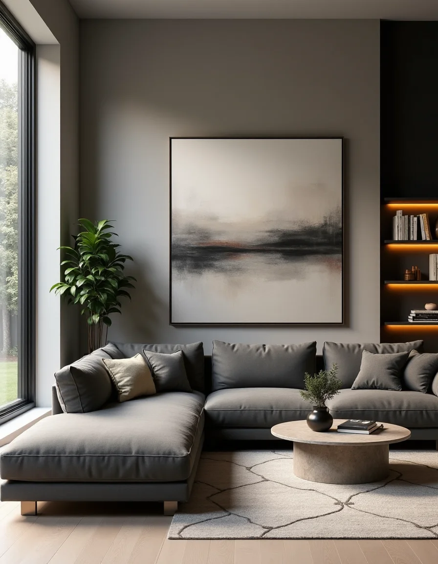 The living room merges modern aesthetics with a serene ambiance, featuring a palette of soft grays and warm taupes. A plush, matte-finish sectional sofa in charcoal is strategically anchored in the center, complemented by a sleek coffee table made from polished stone that gleams under the natural light streaming through large floor-to-ceiling windows. The walls are adorned with unique textured matte paint in a subtle slate hue, while a grand piece of abstract art boasting muted colors creates a focal point above the sofa. To add depth, tall indoor plants in minimalist black planters grace the corners, and a chic area rug with a geometric pattern in soft beige and charcoal unifies the space. Ambient LED strip lighting along a minimalist shelf showcases curated decor items, including ceramic vases and art books, enhancing the contemporary feel.