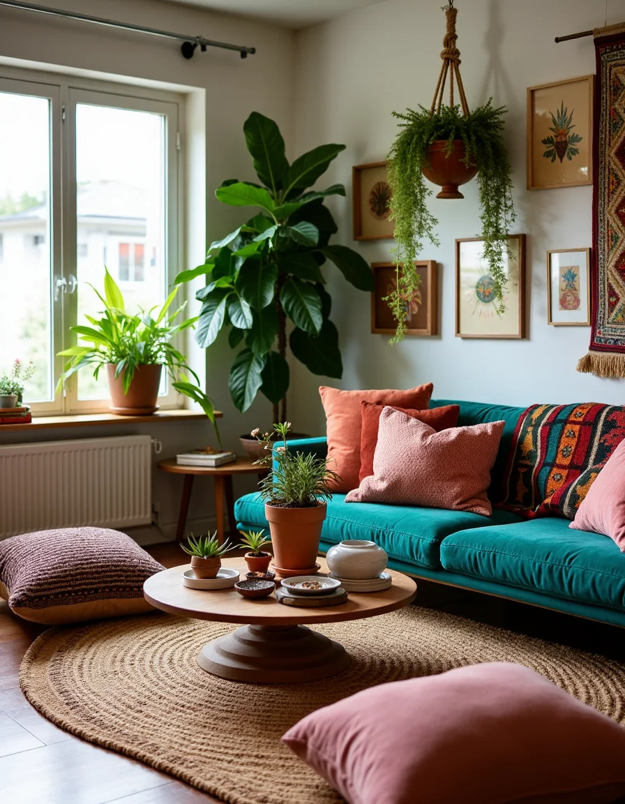 The living room exudes a bohemian vibe with its eclectic mix of patterns and textures that create a warm and inviting atmosphere. A large, woven jute rug graces the floor, anchored by a low, circular wooden coffee table adorned with vibrant ceramic coasters and an assortment of succulents in earthy pots. Fluffy, oversized floor pillows in jewel tones are scattered around, inviting guests to lounge comfortably, while a plush velvet teal sofa with mismatched throw blankets and a tapestry of intricate kilim patterns serves as a stunning focal point. Walls are adorned with an array of framed art featuring abstract designs and cultural symbols, along with macramé plant hangers holding cascading ferns and trailing philodendrons, enhancing the sense of natural abundance throughout the space.