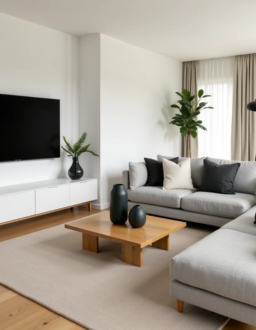 The living room boasts a minimalist style, elegantly emphasizing functionality and durability. A large light gray sectional sofa, upholstered in a textured fabric, is positioned against the far wall, accented with a handful of monochromatic throw pillows in varying shades of charcoal and white. In front of the sofa, a lightweight, rectangular coffee table made of sustainable bamboo serves as both a surface for drinks and a display for two contemporary sculptural vases, each filled with simple green foliage, which adds a splash of color. To the left, a sleek white media console seamlessly integrates technology, while a mounted flat-screen TV maintains an uncluttered aesthetic. Finally, a plush area rug in soft beige centers the space, providing comfort underfoot while grounding the minimalist decor, making the room inviting yet sophisticated.
