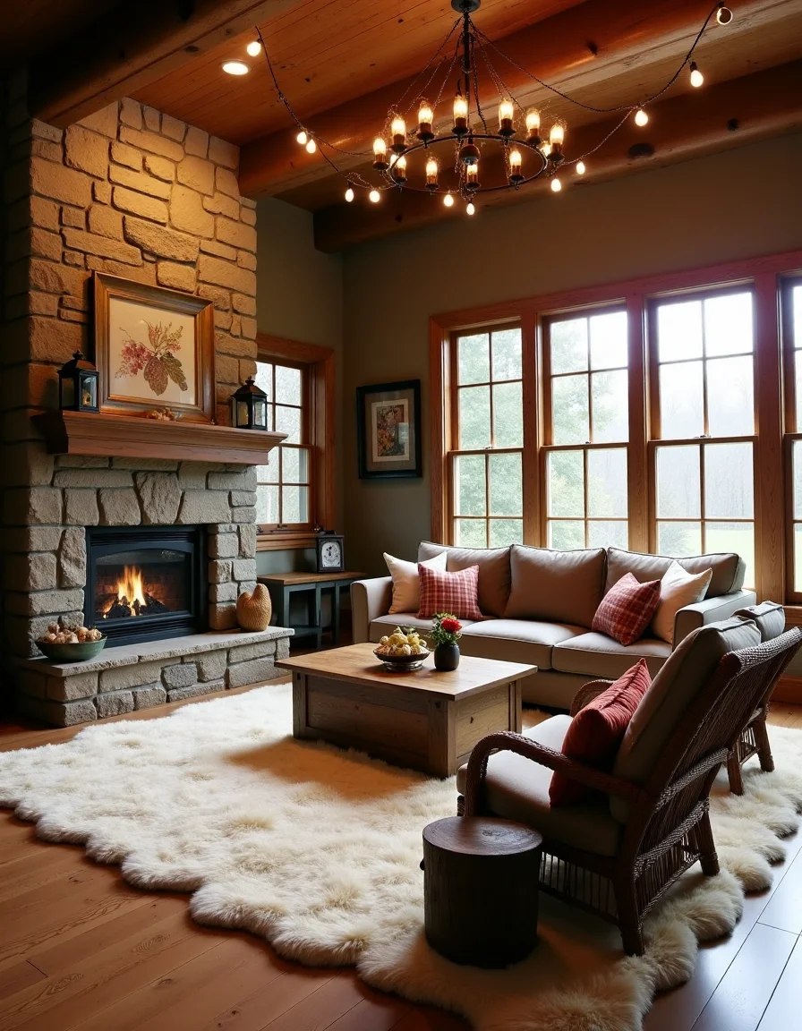The living room exudes a warm, rustic charm with its earthy color palette featuring shades of deep browns, burnt oranges, and muted greens. A large, stone fireplace is the focal point, adorned with a wooden mantel displaying vintage lanterns and framed botanical prints. A plush, cream-colored faux fur rug sprawls across the wide-plank wooden floor, complemented by a cozy, oversized sectional sofa in a rich taupe fabric, dotted with an assortment of plaid and knitted throw pillows. In one corner, a reclaimed wood coffee table sits atop the rug, surrounded by two rustic wicker armchairs, each anchored by small side tables made from tree stumps. To top off the ambiance, softly glowing string lights are draped across the ceiling beams, illuminating the space and adding to its inviting atmosphere.