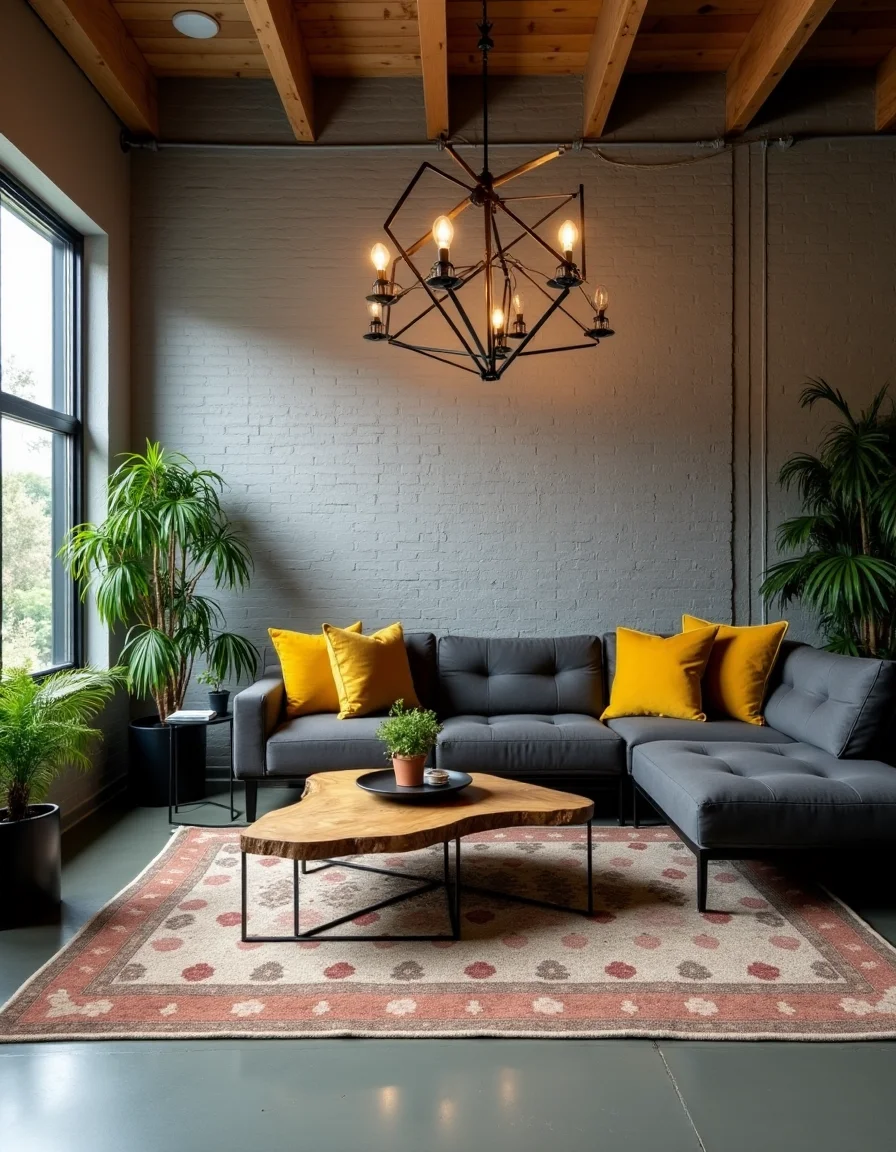 The living room features a spacious, open layout that embraces an industrial style, characterized by a blend of raw materials and contemporary accents. A stunning gray exposed brick wall serves as the backdrop, framing a cozy charcoal sectional sofa arranged in a conversational layout, accented by a few oversized, mustard-yellow throw pillows that pop against the darker tones. A reclaimed wood coffee table with a live edge sits center stage, accompanied by a pair of industrial-style metal side tables in matte black on either side. Overhead, a striking black metal chandelier with Edison bulbs casts warm light across the room, while a large vintage-inspired area rug with geometric patterns in muted earth tones grounds the space. Additionally, tall potted plants in simple black planters are scattered around the room, adding a touch of greenery against the industrial textures and enhancing the overall inviting ambiance.