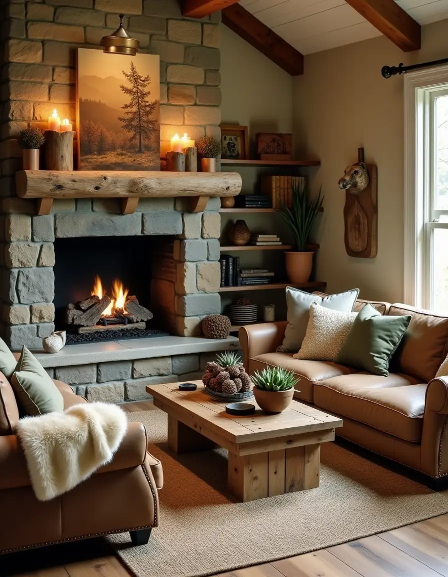The living room exudes a warm and inviting rustic charm, featuring a large stone fireplace adorned with an assortment of wooden mantel decorations, including hand-carved animal figurines and candles in glass holders. The walls are painted in a soft beige, providing a perfect backdrop for the rich textures of the decor. A plush, cream-colored faux fur throw drapes over a weathered leather sectional sofa, which is accented by an array of earth-toned throw pillows in muted greens and browns. On the floor, a jute area rug anchors the space, while a reclaimed wooden coffee table sits centrally, topped with a rustic centerpiece of pinecones and a few potted succulents. Shelves made from reclaimed wood hold an assortment of books and vintage finds, adding to the cozy, laid-back ambiance of the room.