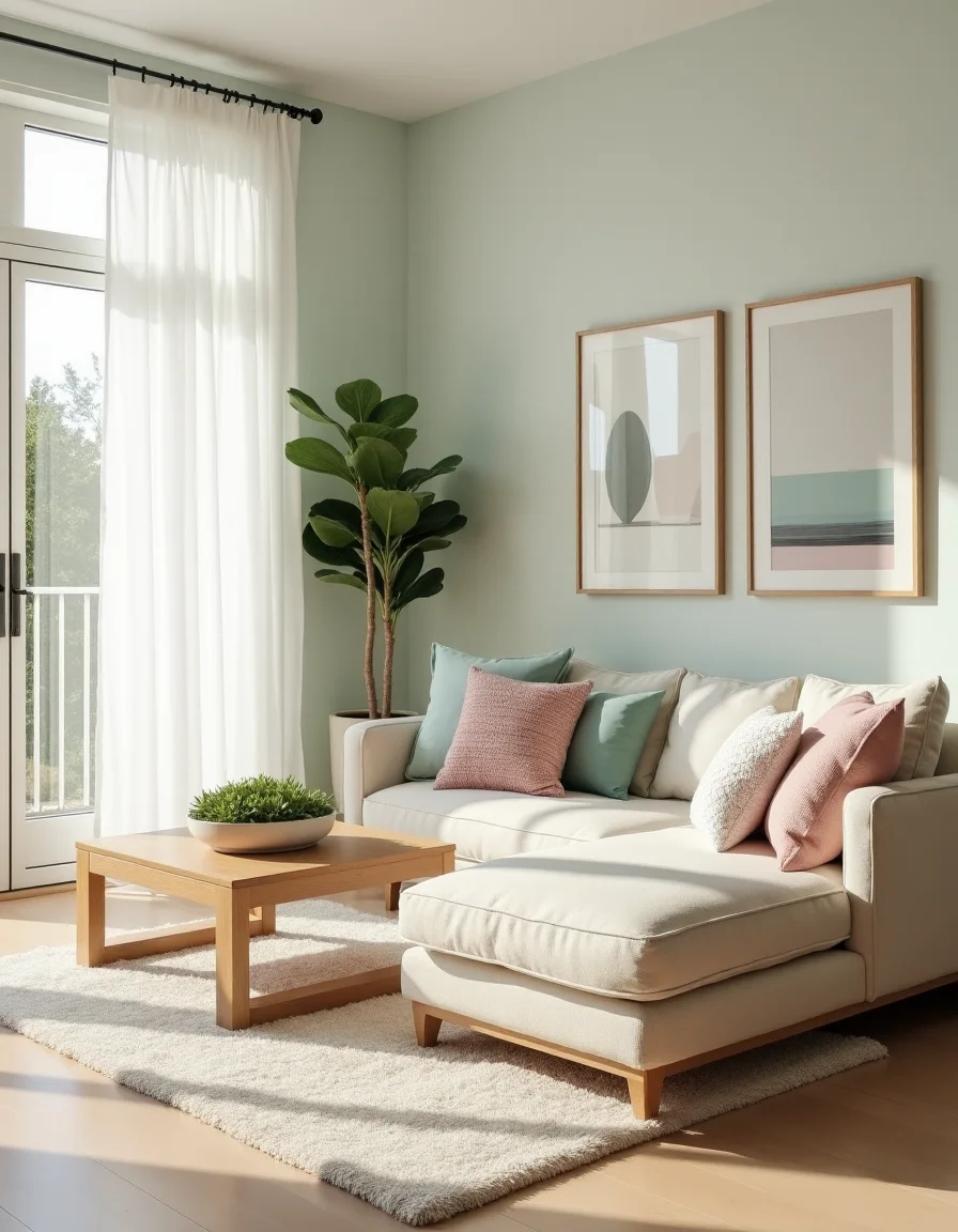 The living room embodies a serene Scandinavian aesthetic, featuring a light, airy atmosphere accentuated by soft pastel colors like mint green and blush pink. A plush, cream-colored L-shaped sectional sofa anchors the space, adorned with an assortment of knitted throw pillows in complementary shades. To one side, a natural wood coffee table with clean lines showcases a small succulent garden, while a fluffy white area rug adds texture underfoot. Floor-to-ceiling white curtains drape gracefully beside large windows, allowing the gentle sunlight to spill in and illuminate the room, which is enhanced by minimalistic wall art depicting abstract landscapes. A tall, leafy indoor plant stands in a ceramic pot, bringing a touch of nature to the modern decor.