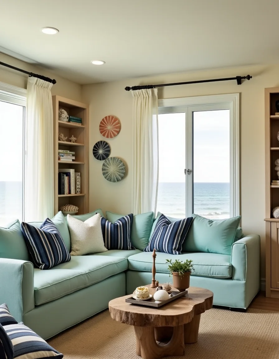 The living room exudes a serene seaside atmosphere, featuring soft, sandy beige walls that evoke beachside tranquility. A large, comfortable sectional sofa covered in light aqua fabric is positioned in the center, adorned with navy-blue and white striped cushions resembling beach umbrellas. Natural light floods the space through expansive, sheer white curtains, while a weathered driftwood coffee table rests in front of the couch, surrounded by petite seashell decor. Light oak bookshelves line one wall, holding nautical-themed books and small potted succulents, while a jute rug anchors the room with earthy texture underfoot, complemented by a trio of hand-painted seashell wall art that brings the oceanic ambiance full circle.