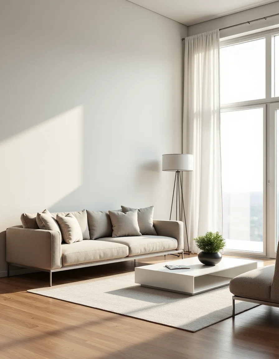 The living room embodies a serene minimalist aesthetic with an emphasis on negative space, allowing the bright natural light to flood in through expansive floor-to-ceiling windows. A low-profile beige sectional sofa, adorned with a couple of pale gray throw pillows, is strategically positioned at a slight angle, enhancing the openness of the layout. In front of the sofa, a sleek white coffee table made of lacquered MDF holds a single green succulent in a matte black ceramic pot, bringing a hint of organic life into the space. The walls are adorned with subtly textured white paint, lending an added dimension, while a simple rectangular area rug in soft ivory delineates the sitting area against the light oak hardwood flooring. Near the windows, an elegant metal-framed accent chair echoes the minimalist theme, while a tall, slim floor lamp with a white linen shade stands as the only illumination source aside from natural light, casting a gentle glow as day turns to night.