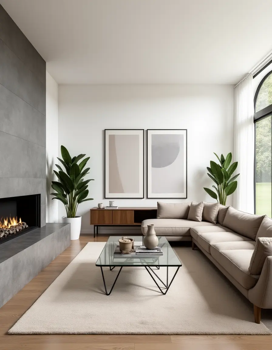 This modern living room exudes sophistication with its sleek, clean lines and a minimalist design. The centerpiece is a large, plush sectional sofa upholstered in a light taupe fabric, positioned to face a contemporary stone fireplace clad in smooth gray slate, which adds an element of warmth to the space. A glass coffee table with a geometric metal base sits atop a soft, cream area rug, enhancing the room's inviting atmosphere. Floor-to-ceiling windows draped with sheer white curtains allow natural light to flood the area, illuminating the walls painted in a crisp white, while strategically placed potted greenery adds a fresh touch of color and life. Adjacent to the sofa, a sleek, wooden media console integrates smart technology, while abstract art pieces in muted tones complete the room's sophisticated yet comfortable ambiance.