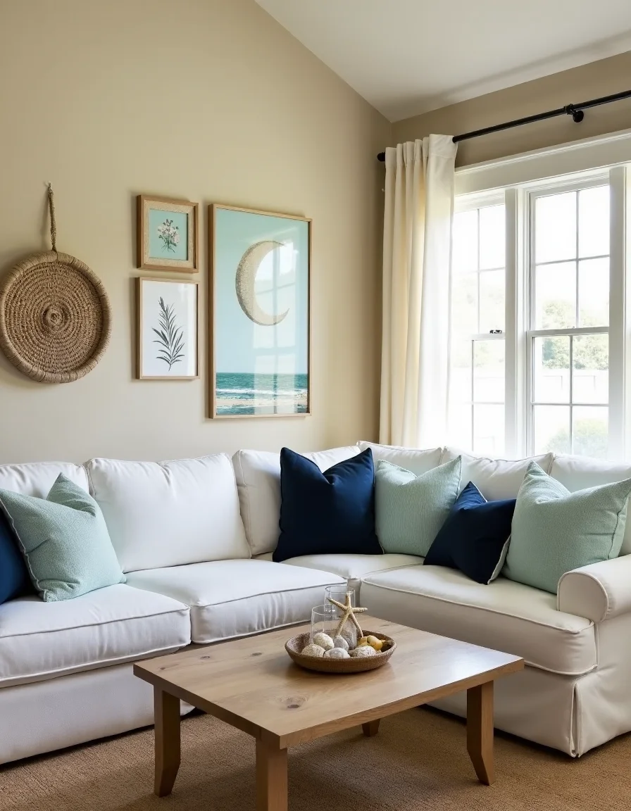The living room exudes a serene seaside ambiance, with walls adorned in a soft beige hue that mimics the sandy shores. A plush white sectional couch, accented with navy blue and light turquoise pillows, serves as the focal point in an inviting arrangement, perfectly positioned in the center of the room to create a communal space. In front of the couch, a natural wood coffee table features a weathered finish, topped with a few coastal-themed decorative pieces, including a starfish and a shell collection within a clear glass bowl. Light sheer curtains gently billow over large windows, bathing the room in natural light, while a jute area rug lies beneath the coffee table, adding an earthy texture that harmonizes with the aesthetic. Various framed botanical prints and a woven hanging decoration inspired by marine life adorn the walls, enhancing the peaceful coastal vibe.