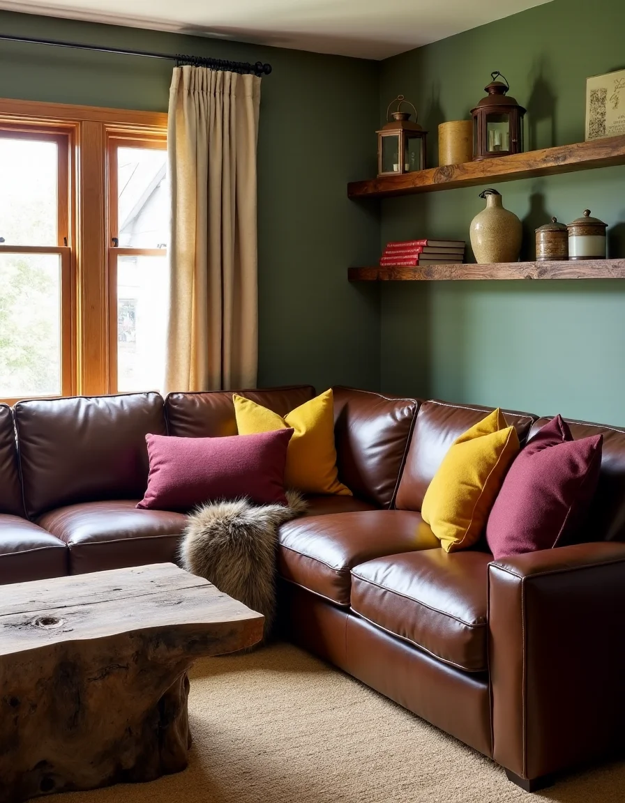 The living room exudes a warm, rustic charm with its cozy design and earthy hues. A large, plush, deep brown leather sectional sofa dominates the space, adorned with an array of handmade wool throw pillows in rich shades of burgundy and mustard yellow, inviting comfort. In front of the sofa, a weathered wooden coffee table with a live-edge surface serves as a centerpiece, surrounded by a woven sisal rug that adds texture beneath. Rustic wall shelves made from reclaimed barn wood display an assortment of fur accents, including a faux fur throw blanket draped casually over the arm of the sofa and a collection of vintage lanterns for ambient lighting. The walls are painted a soft sage green, allowing the natural light from the large bay window adorned with sheer linen curtains to create a bright yet inviting atmosphere.