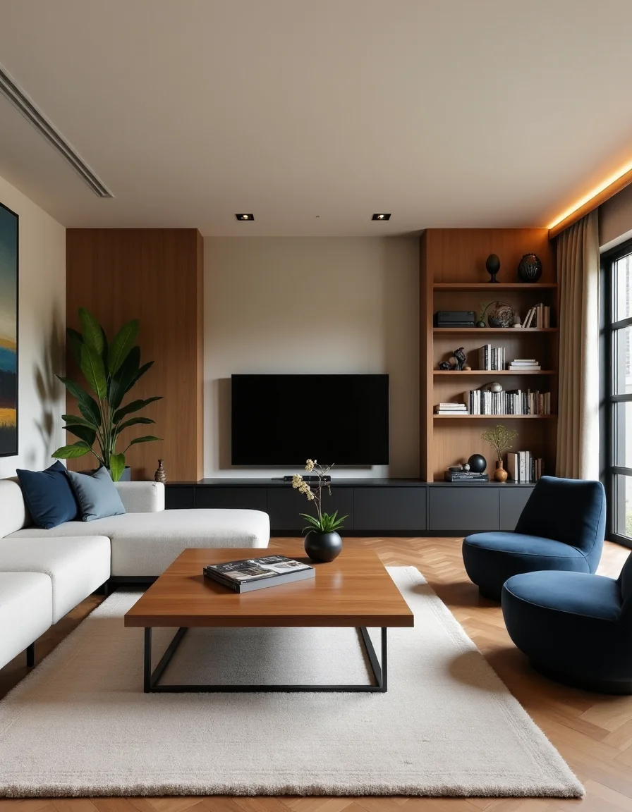 The modern living room features a palette of soft earth tones, highlighted by rich wooden accents that create a warm and inviting atmosphere. A sleek, rectangular coffee table with a walnut finish sits at the center, surrounded by a minimalist sectional sofa upholstered in light gray fabric, with clean lines that reinforce the contemporary design. On one wall, a large abstract painting in muted blues and ochres adds a pop of color, framed by custom-made floating shelves that display carefully curated books and geometric decor. A streamlined media console in black wood houses a flat-screen TV, complemented by a pair of stylish, modern armchairs in a deep navy blue positioned nearby, offering both comfort and style. Finished with a plush area rug in a subtle herringbone pattern, the room exudes a sense of sophistication and tranquility, perfect for relaxation or entertaining guests.