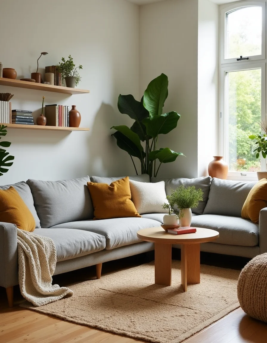 This Scandinavian-inspired living room exudes a cozy, inviting atmosphere with its emphasis on natural materials and functional design. The space features a large, soft gray sectional sofa adorned with oversized, knitted throw blankets in earthy tones, paired with an oak coffee table that showcases the wood's natural grain. Tall potted plants such as fiddle leaf figs and snake plants are strategically placed near the window, allowing for plenty of natural light to illuminate the lush greenery. A minimalist shelf made of light-colored wood displays a curated selection of books and decorative ceramics, while a woven jute rug with geometric patterns grounds the room, tying together the various textures found in the space. Muted olive green and warm beige accent pillows add layers of comfort and a subtle touch of color, enhancing the overall tranquility of the room.