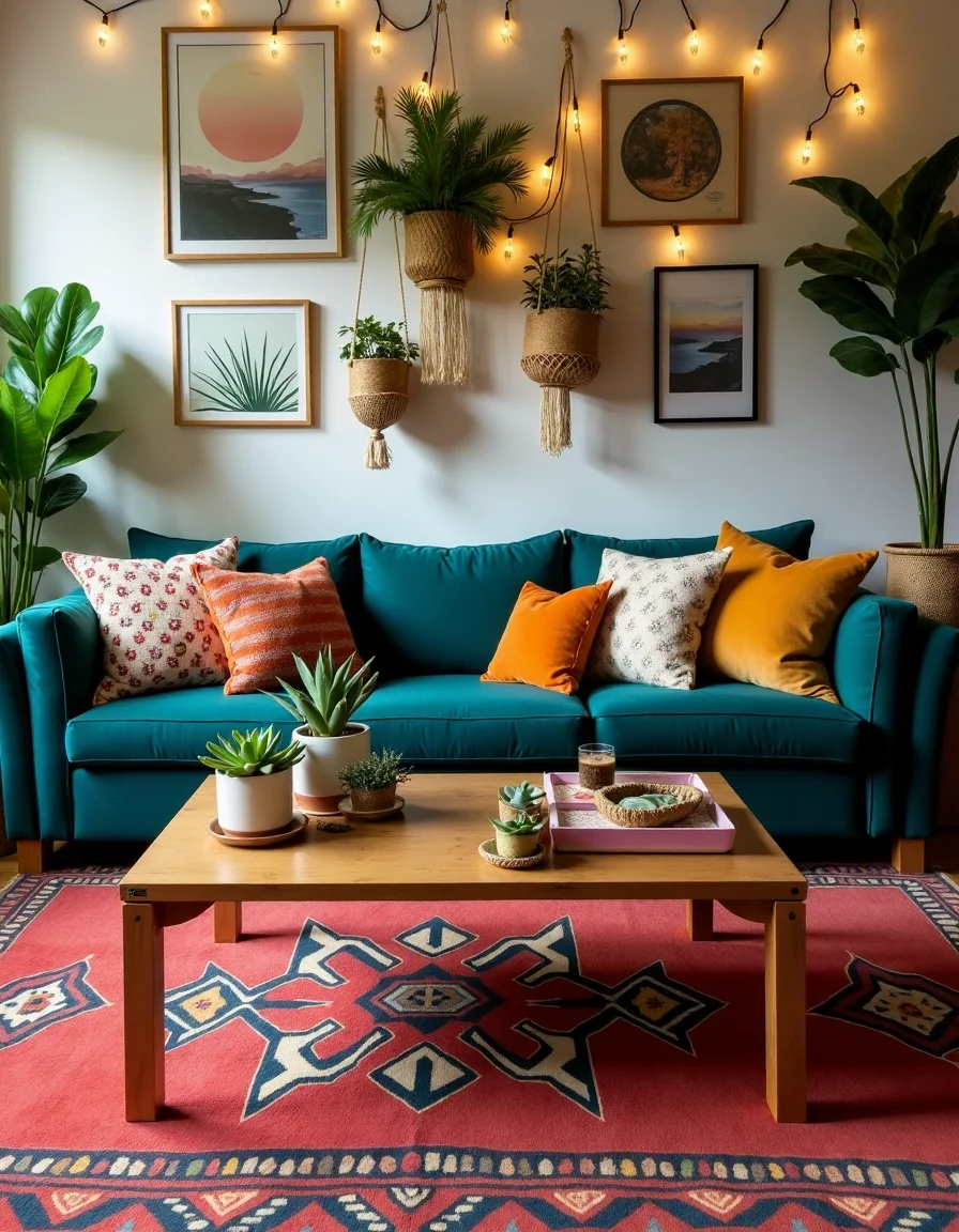 The living room exudes a vibrant bohemian vibe, accentuated by rich textures and eclectic furnishings. A large, overstuffed velvet sofa in deep teal is adorned with an array of mismatched throw pillows in bright patterns, including floral and paisley designs. A vintage Indian kilim rug with bold geometric shapes lies under a rustic wooden coffee table, which hosts an assortment of potted succulents and a collection of colorful, handwoven coasters. On the walls, framed artwork featuring abstract patterns and natural landscapes hang beside carefully placed macramé wall hangings, creating a warm and inviting atmosphere filled with personal touches. Twinkling fairy lights draped above lush, green plants in wicker baskets add a magical glow, completing the cozy, carefree aesthetic.