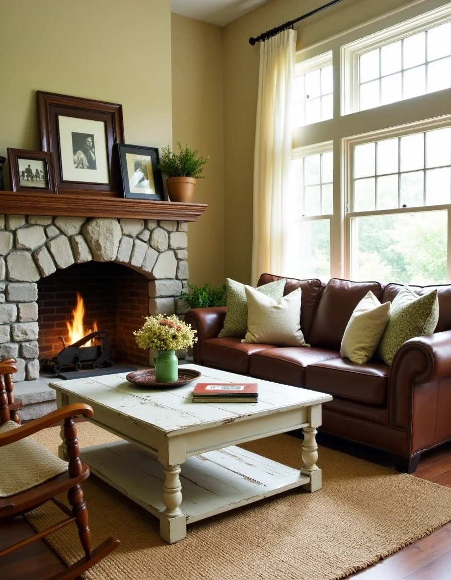 The living room exudes a warm, inviting country charm, anchored by a rugged stone fireplace that crackles softly, surrounded by a hand-carved wooden mantel decorated with framed family photographs and rustic antiques. Soft neutral tones dominate the space, with creamy beige walls complementing the deep brown tones of a distressed leather sofa adorned with patterned throw pillows in muted greens and browns. An oversized woven jute rug lies beneath a farmhouse-style coffee table, which features a weathered white finish and serves as a base for an arrangement of wildflowers in a vintage mason jar. A pair of wooden rocking chairs, painted in a soft sage green, flank the fireplace, while natural light pours in through sheer white curtains that gently billow with the breeze, creating an overall ambiance of comfort and relaxation that echoes the simplicity of country living.