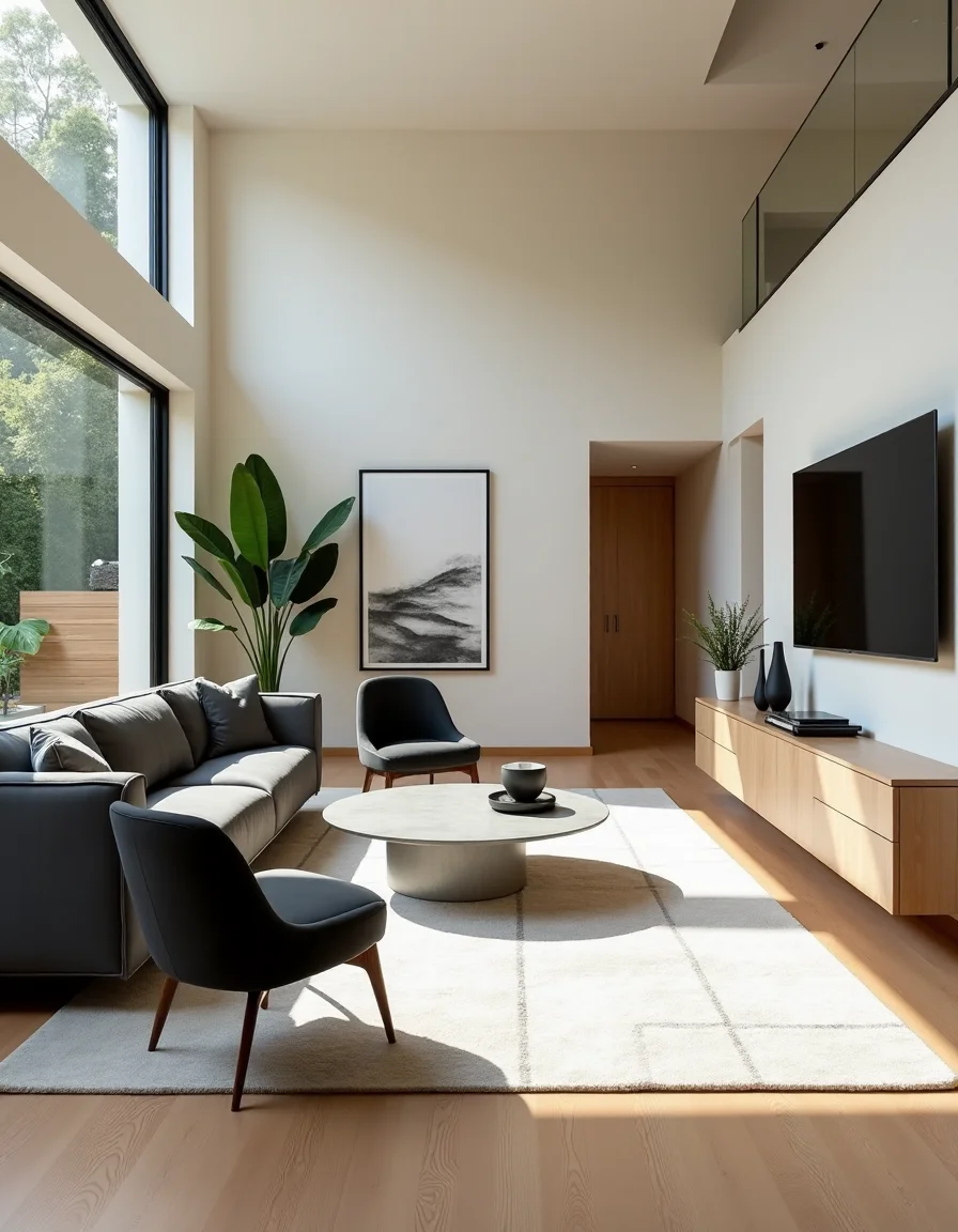 The living room features a modern aesthetic characterized by sleek lines and an open layout bathed in natural light streaming through large, floor-to-ceiling windows. A minimalist sectional sofa in a graphite gray fabric is positioned centrally on a plush, oversized area rug in a subtle geometric pattern of whites and light grays, promoting comfort and relaxation. Beside the sofa, a low-profile coffee table crafted from polished concrete adds an industrial touch while serving as a functional centerpiece. A pair of sculptural, matte black accent chairs flank the sofa, and a floating media console in light oak provides a modern contrast, housing a flat-screen TV mounted against a pale beige wall. Wall art comprised of simple black-and-white photography enhances the sophisticated ambiance, while strategically placed potted plants introduce a hint of nature into the crisp, clean environment.