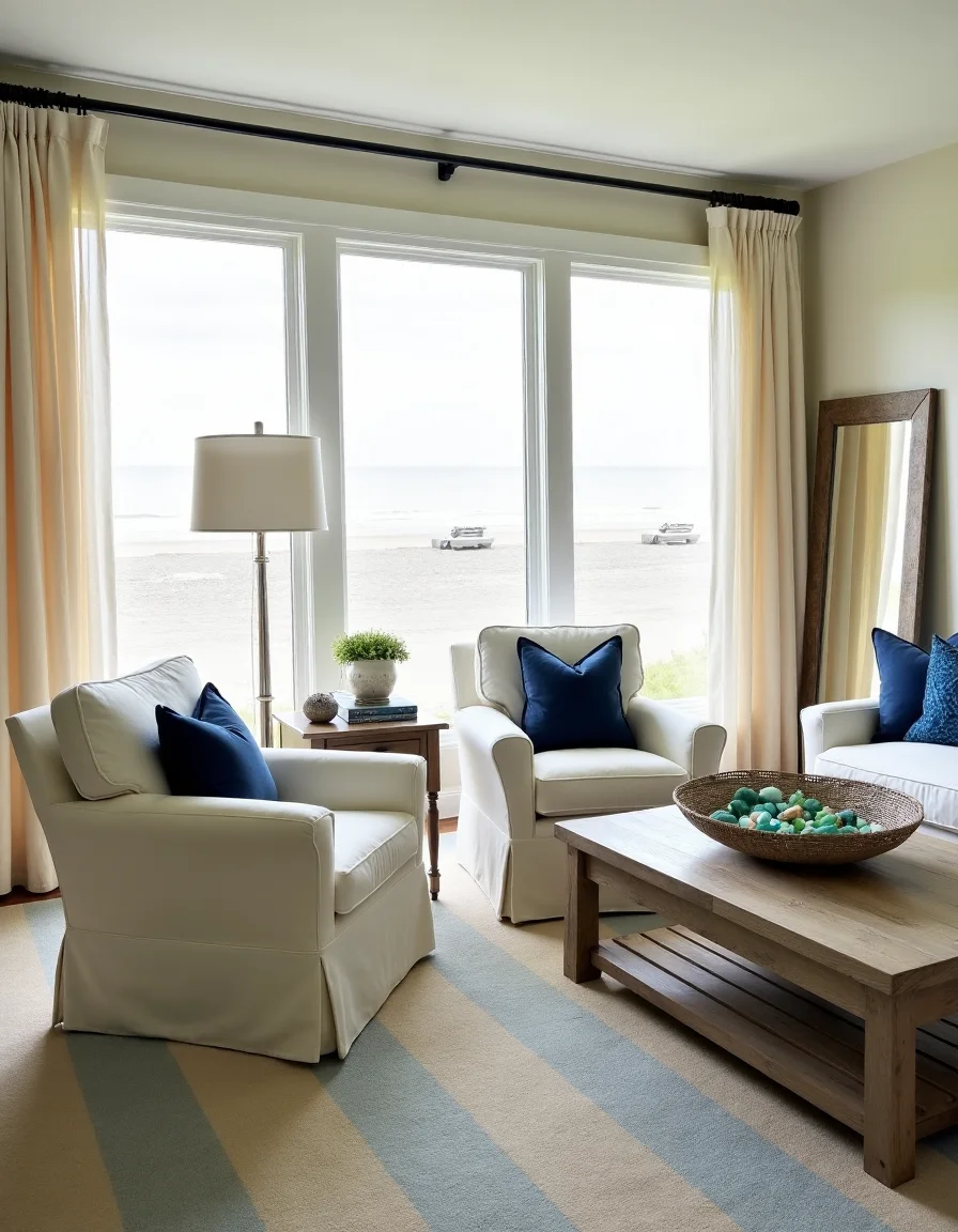 The living room embodies a serene seaside style, bathed in natural light thanks to its large, floor-to-ceiling windows that overlook a sandy beach. A soft, striped carpet in hues of sandy beige and ocean blue anchors the space, providing a cozy area for relaxation. Light, airy curtains made of sheer linen billow gently around the windows, allowing sea breezes to flow through. A pair of oversized, comfortable armchairs upholstered in a crisp white fabric with navy blue throw pillows are positioned near a reclaimed wood coffee table adorned with sea glass accents. Encased in white wainscoting, the walls display splashes of ocean-themed art, and a driftwood mirror leans against one wall, reflecting the coastal ambiance throughout the room.