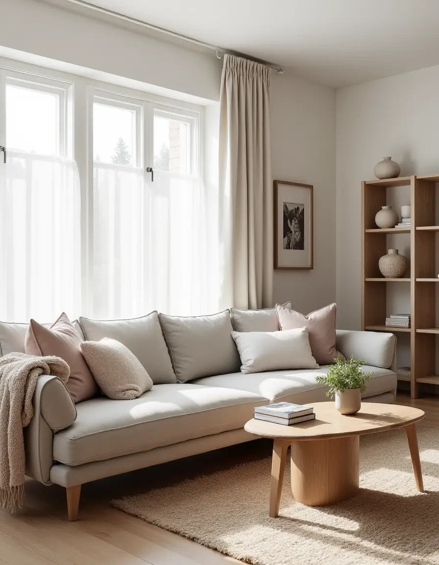 The living room exudes a cozy Scandinavian charm, showcasing a harmonious blend of natural materials and soft tones. The focal point is a plush, light gray sectional sofa adorned with muted pastel throw pillows and a chunky knit blanket draped over one arm. A rustic oak coffee table sits in front, complete with a potted succulent and a stack of art books. The walls are painted in a soft white, enhancing the airy feel, while a hand-woven wool rug in subtle earthy tones grounds the space. Large windows allow natural light to flood the room, complemented by sheer linen curtains that gently sway with a breeze, while a tall, wooden bookshelf brims with carefully curated decor pieces, such as ceramic vases and framed photographs, accentuating the minimalist essence of Scandinavian design.