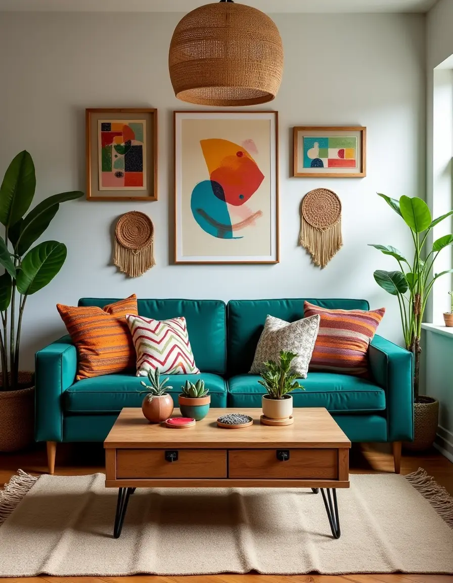 The living room exudes a warm bohemian charm, with a plush, deep teal velvet sofa adorned with colorful, mismatched throw pillows featuring intricate patterns. A vintage coffee table, crafted from reclaimed wood, sits at the center, topped with an eclectic mix of potted succulents and artisanal coasters. The walls are adorned with a gallery of vibrant paintings and woven wall hangings, showcasing abstract designs and natural motifs, adding an artistic flair. Soft, ambient lighting is provided by a rattan pendant lamp hanging overhead, while a delicate, fringed area rug in earthy tones anchors the space, inviting barefoot strolls in its comfort. A pair of tall, leafy indoor plants flanks the window, enhancing the cheerful atmosphere and bringing a touch of nature indoors.