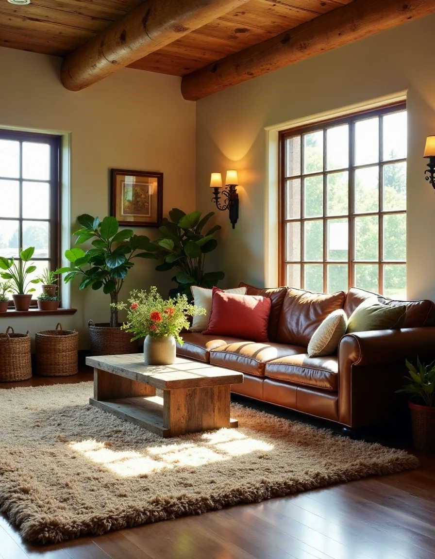 The living room epitomizes rustic charm, featuring exposed wooden beams on the ceiling paired with a warm, earthy color palette of browns, greens, and cream. A large, plush area rug made of shaggy wool in soft beige spreads across the hardwood floor, grounding the space and inviting comfort. In one corner, a cozy, distressed leather sofa with throw pillows in rich jewel tones offers a perfect spot for relaxation, while a reclaimed wood coffee table, adorned with a vase of wildflowers, sits at the center. The walls are illuminated by wrought iron sconces, casting a soft glow that highlights an assortment of framed nature-inspired art pieces and woven baskets used as decorative storage. Large, potted plants, like ferns and snake plants, thrive in natural sunlight streaming in from the oversized windows, enhancing the inviting ambiance of the room.