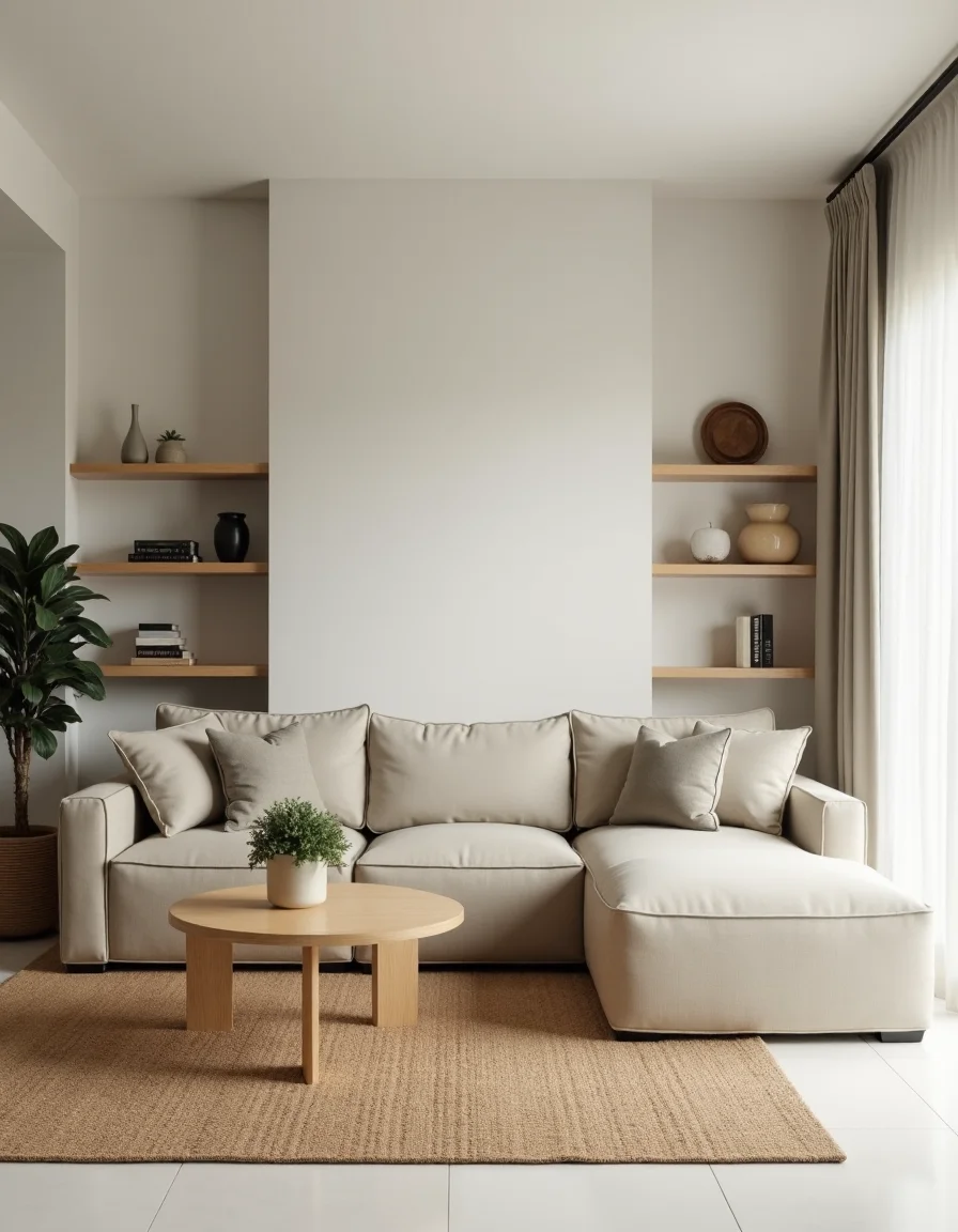 The living room embodies a minimalist style, featuring a palette of soft grays and warm whites that create an airy atmosphere. A sleek beige sectional sofa with clean lines rests against one wall, adorned with a few monochromatic cushions for comfort while maintaining simplicity. A low-profile coffee table, made of light oak, sits centrally, accompanied by a single lush green potted plant that introduces a touch of nature without overwhelming the space. Along the opposite wall, a pair of open shelves display a curated collection of decorative items in neutral tones intermixed with negative space, reinforcing the minimalist charm. A soft, handwoven beige rug encompasses the seating area, lending texture to the room without detracting from its serene essence.