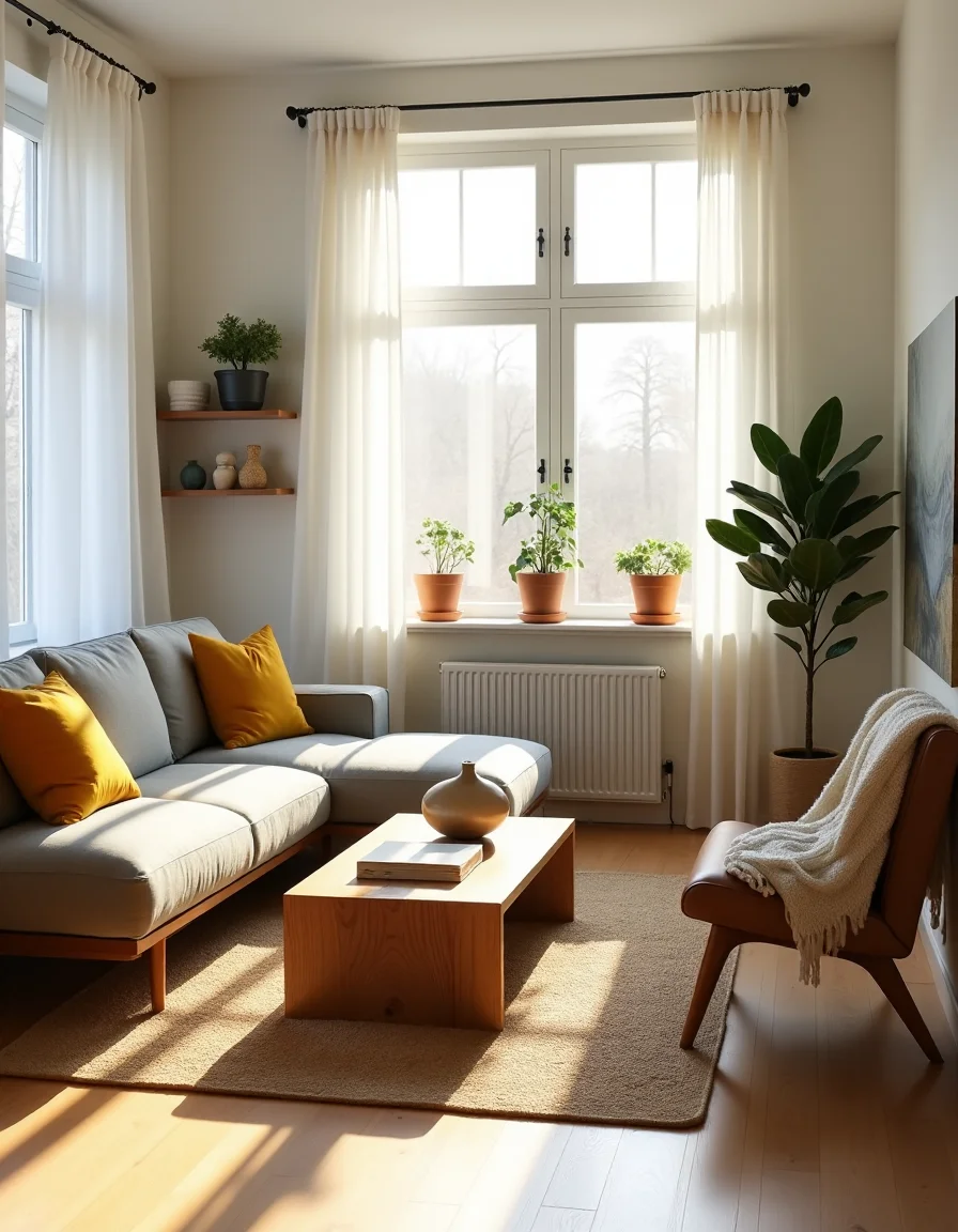 The living room is a serene Scandinavian-inspired space with an airy ambiance, featuring light wooden floors that perfectly complement the whitewashed walls. An oversized sectional sofa in soft grey linen, adorned with plush mustard-yellow throw pillows, is positioned centrally, inviting relaxation. A sleek coffee table made of reclaimed wood rests on a handwoven jute rug, harmoniously juxtaposing the natural elements of the room. Golden sunlight streams through sheer white curtains framing large windows, highlighting a collection of potted greenery, including a tall fiddle leaf fig and a hanging string of pearls balanced atop floating wooden shelves. Accessories such as a minimalist ceramic vase and a cozy knitted blanket drape over an accent chair, tying the space together with warmth and simplicity.