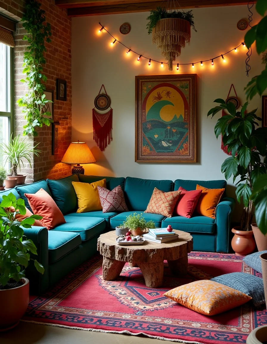 The living room embodies a vibrant bohemian style, with an abundance of lush, leafy plants cascading from hanging macramé planters and nestled in eclectic ceramic pots on the floor. A large, vintage Persian rug in shades of deep red and burnt orange anchors the space, while a comfortable, overstuffed teal sofa is adorned with an array of patterned pillows in vivid hues of gold, indigo, and coral. A reclaimed wood coffee table with whimsical carvings is positioned centrally, topped with a collection of colorful art books and trinkets from around the world. The walls are adorned with an assortment of framed tapestries and dreamcatchers, creating a layered look, and colorful string lights hang from the ceiling, casting a warm and inviting glow throughout the room. Beside the sofa, a retro floor lamp with a fringed shade offers a touch of whimsy, while a corner splayed with vibrant throws and cushions invites relaxation and daydreams.