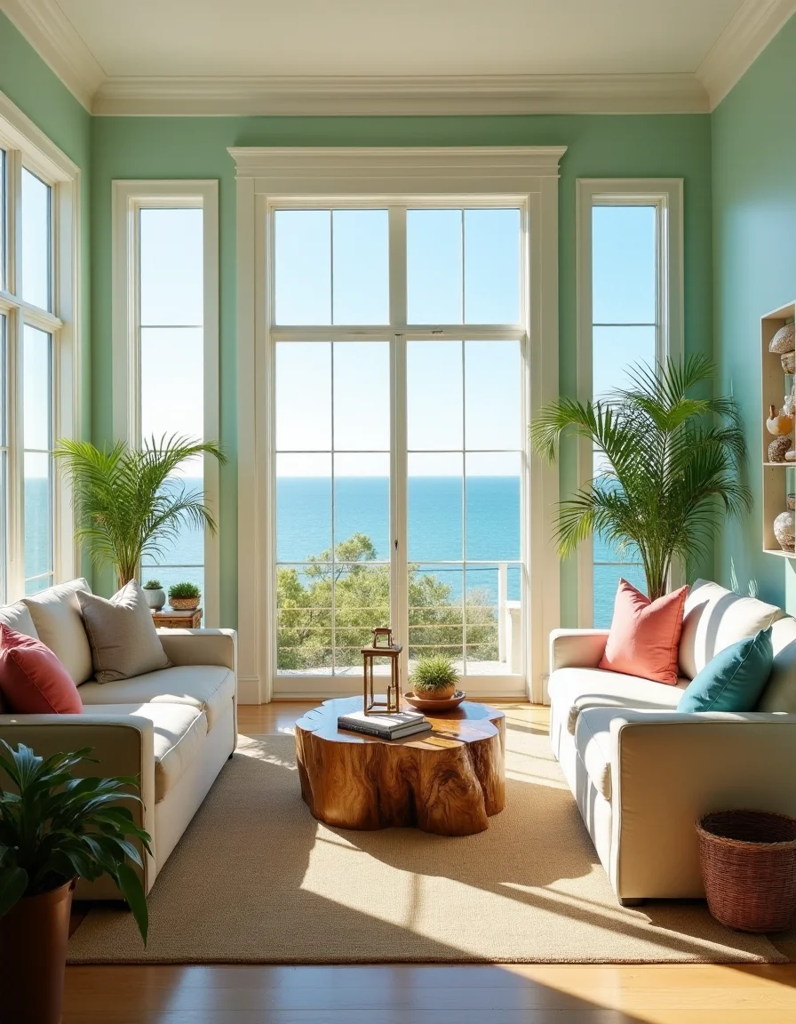 The living room is a serene seaside sanctuary, immediately inviting with its spacious layout and generous large windows that frame breathtaking ocean views, allowing natural light to flood the space. The walls are painted a soft, airy seafoam green, paired harmoniously with crisp white trim, which accentuates the beachy vibe. Plush, sandy-beige sofas are arranged around a driftwood coffee table at the center, complemented by throw pillows in soft blues, coral, and light gray, evoking the colors of the sea. A light jute area rug anchors the seating area, while a collection of nautical-themed decor, such as a starfish-themed wall art and seashell accents scattered on shelves, tie the space together with a casual, relaxed feel. Lush potted palm trees and succulent plants are strategically placed in corners, enhancing the natural flow and bringing a touch of the outdoors in, creating an overall atmosphere of coastal tranquility.