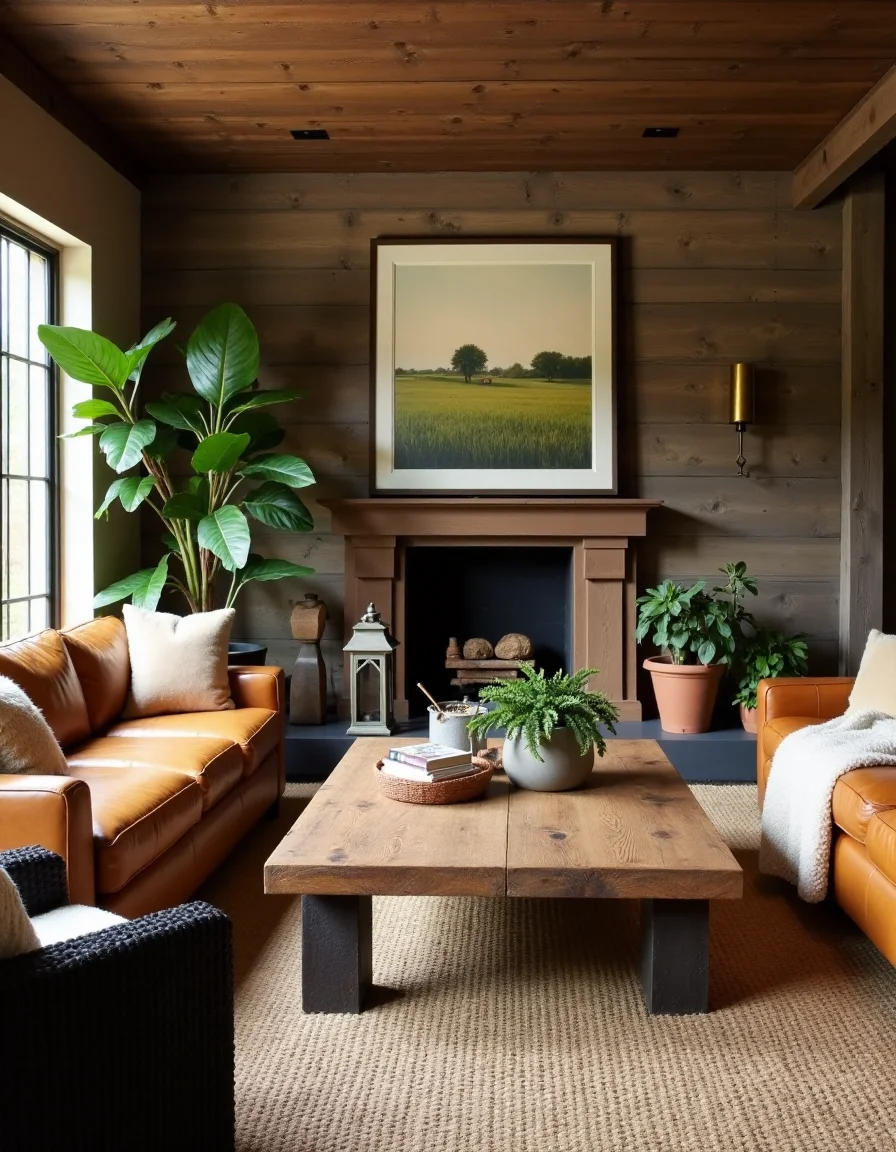 The living room exudes rustic charm with a warm, inviting ambiance, featuring a large, weathered oak coffee table at the center, surrounded by a pair of soft tan leather sofas adorned with cream-colored fur throws. On one side, a dark wicker armchair complements the seating arrangement and holds an oversized knit blanket draped over its arm. The walls are clad in reclaimed barn wood, providing a rugged backdrop for vintage-inspired artwork that depicts serene pastoral scenes. Unfussy decorative elements, like a series of aged metal lanterns and a collection of terracotta pots filled with lush green plants, enhance the organic feel of the space, while a large, woven area rug anchors the room with its natural fibers and subtle earth tones.