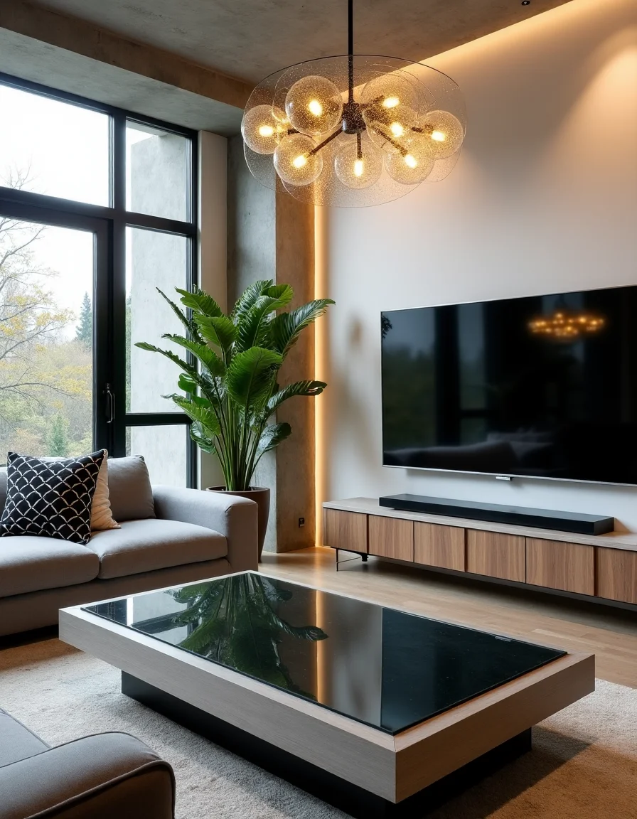 The modern living room showcases a harmonious blend of glass and concrete, featuring sleek clean lines that define the space. A large, rectangular glass coffee table occupies the center, reflecting the light from an oversized modern chandelier that hangs from a concrete ceiling. A plush gray sectional sofa with sharp edges is positioned against one wall, accentuated by a pair of geometric patterned throw pillows in monochrome shades. On the opposite side, a minimalist media console made of concrete and walnut holds a sleek flat-screen TV, while large potted plants with tall greenery add a touch of life, contrasting beautifully with the industrial elements of the room. The walls are painted in a soft off-white, complementing the dark concrete features, while a textured area rug in neutral tones anchors the seating arrangement.