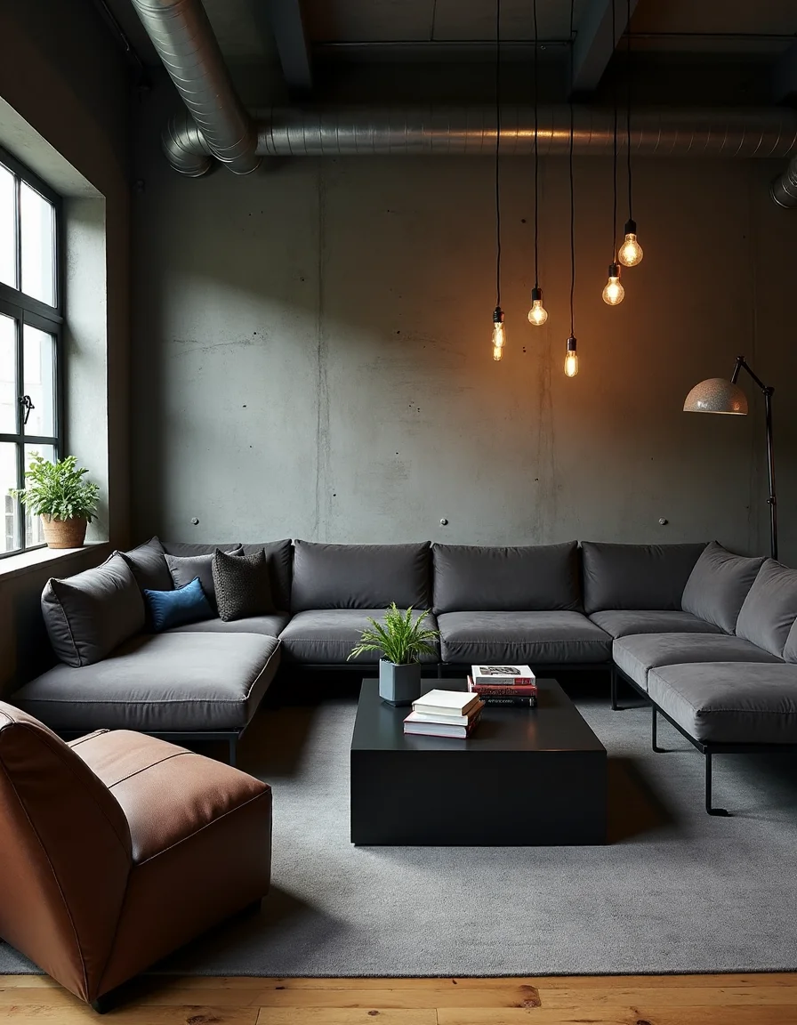 The living room features an industrial style with a bold color palette of deep charcoal and various shades of black. An exposed concrete wall sets the stage, enhanced by a sleek, sectional sofa upholstered in textured, dark gray fabric, complemented by an oversized, weathered brown leather armchair positioned nearby. A stark, black metal coffee table sits centrally, adorned with a collection of books and a small succulent in a geometric planter, while the floor is finished in reclaimed wood adding warmth to the space. Industrial light fixtures, such as Edison bulb pendant lights hanging from metal piping, illuminate the room's raw aesthetics, alongside decorative touches like a vintage steamer trunk that serves as a unique storage solution in one corner.