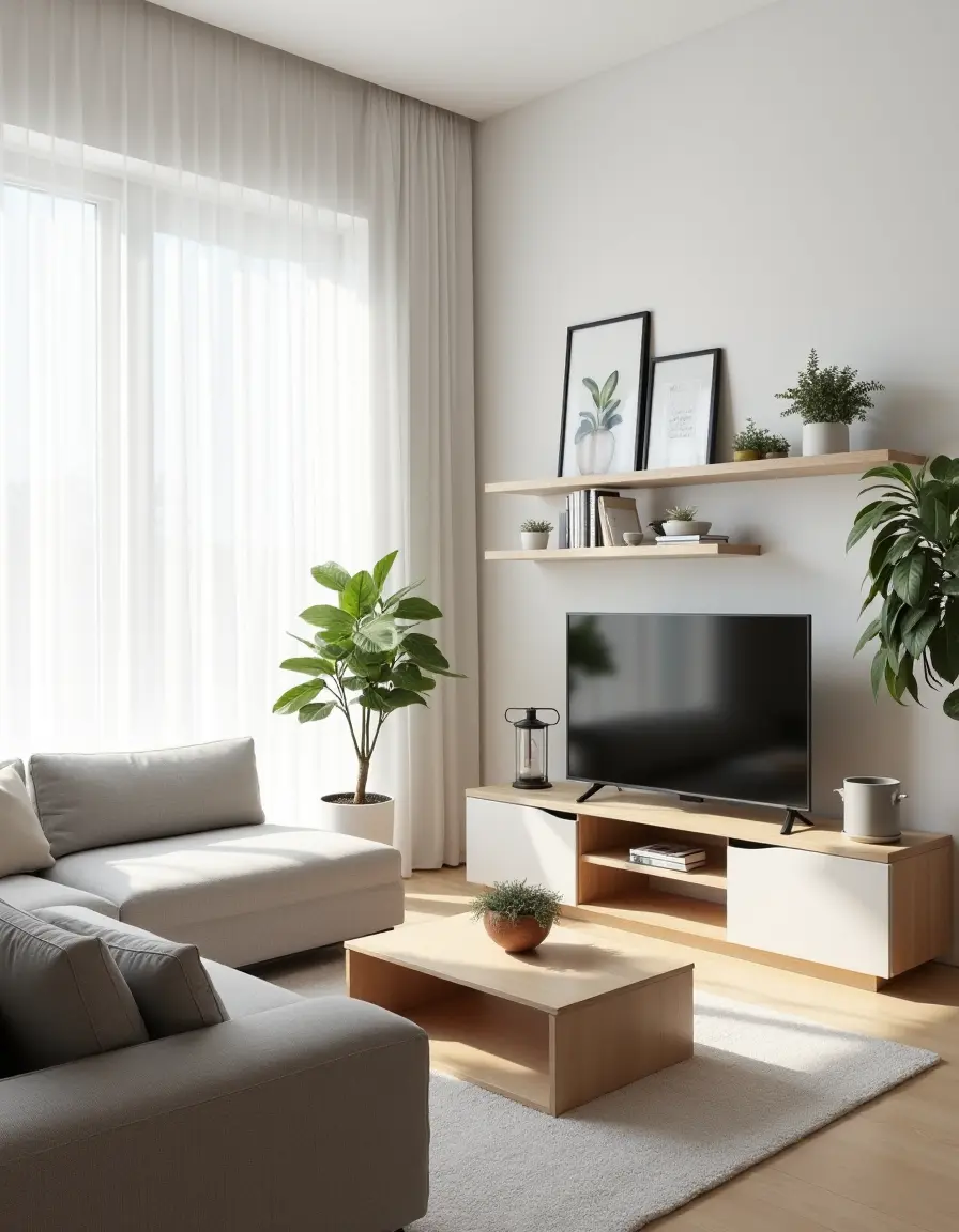 The living room embodies a minimalist design characterized by a streamlined, uncluttered layout. A low-profile sectional sofa upholstered in a durable, light gray fabric is positioned against a white wall, paired with a matching minimalist coffee table crafted from light oak, which features clean lines and ample surface space for both decor and functionality. To the side, a sleek media console made of plywood holds a flat-screen TV, while open shelving above displays an array of indoor plants and black-and-white framed artwork, adding a simple yet stylish touch to the room. Natural light floods the space through sheer white curtains, enhancing the serene atmosphere created by the muted color palette of soft whites and grays, complemented by pops of greenery around the room.