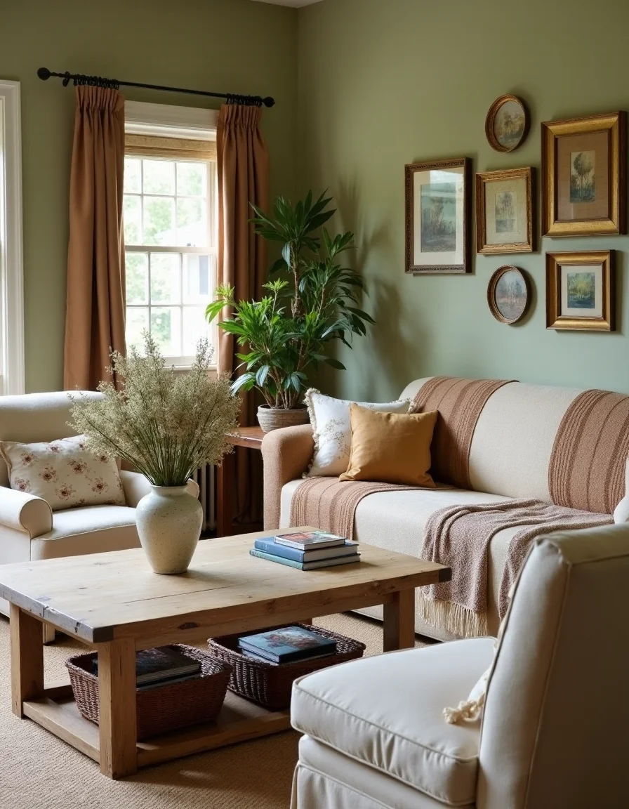 The living room exudes a warm and inviting country charm, featuring soft earthy tones of sage green, beige, and rich terracotta. A large, distressed wooden coffee table sits at the center, adorned with a weathered, white ceramic vase holding wildflowers, adding a touch of freshness. Flanking the table are a pair of comfortably upholstered armchairs covered in soft cream fabric with subtle floral patterns, while a vintage patchwork sofa in muted tones of brown and cream creates a cozy gathering spot against the wall adorned with a curated gallery of antique frames and nature-inspired artwork. Throughout the space, handmade woolen throw blankets drape over the furniture, and decorative wicker baskets filled with assorted cushions and magazines provide both functionality and rustic decor, harmoniously defining this inviting and serene living area.