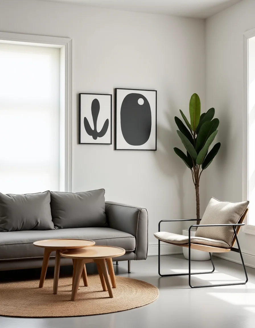 This minimalist living room exudes tranquility and sophistication with its clean lines and simple elegance. A low-profile gray sofa, upholstered in a durable yet soft fabric, takes center stage, paired with a set of three sleek Scandinavian-style nesting tables in natural oak, which are neatly arranged beside it. Adjacent to the sofa, a trio of contemporary accent chairs with minimalist metal frames and muted beige cushions creates an inviting seating area without overcrowding the space. The room is warmed with a handwoven beige area rug, while a single large indoor plant in a simple white pot adds a touch of life next to a large, unadorned window that invites ample natural light. Artfully hung on one stark white wall, two abstract black and white prints complement the serene atmosphere, emphasizing the sleek, uncluttered aesthetic of minimalist design.