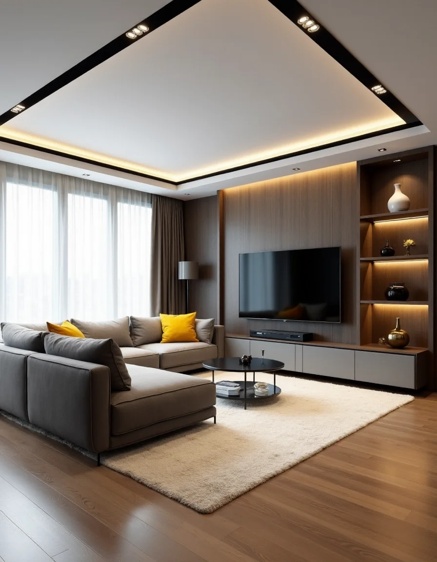 The living room features a spacious and airy feel with high ceilings adorned with sleek, matte black recessed lighting. A large, L-shaped sectional sofa in a luxurious gray fabric sits at the center, accented with vibrant mustard yellow throw pillows for a pop of color. Across from the sofa, a minimalist glass coffee table rests on a soft white area rug that adds warmth to the matte hardwood flooring. A contemporary entertainment unit made of dark wood and frosted glass shelving is mounted on the wall, housing a state-of-the-art flat-screen television and stylish decorative items like geometric vases. Floor-to-ceiling windows draped with sheer white curtains allow natural light to flood in, blending seamlessly with the room's modern aesthetic.