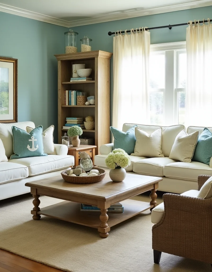 This inviting seaside-themed living room blends coastal charm and comfort seamlessly. A soft, sandy beige striped carpet drapes across the floor, harmonizing beautifully with the laid-back ambiance. Overstuffed plush seating in pale aqua and creamy white boast nautical-themed throw pillows adorned with seashells and anchors, perfectly arranged around a rustic driftwood coffee table. Flanking the seating area are weathered wooden bookshelves filled with maritime novels and decorative glass jars containing collected seashells. Light-filtering sheer curtains sway gently in the ocean breeze, complemented by a pastel blue accent wall that captures the peace of a tranquil beach.
