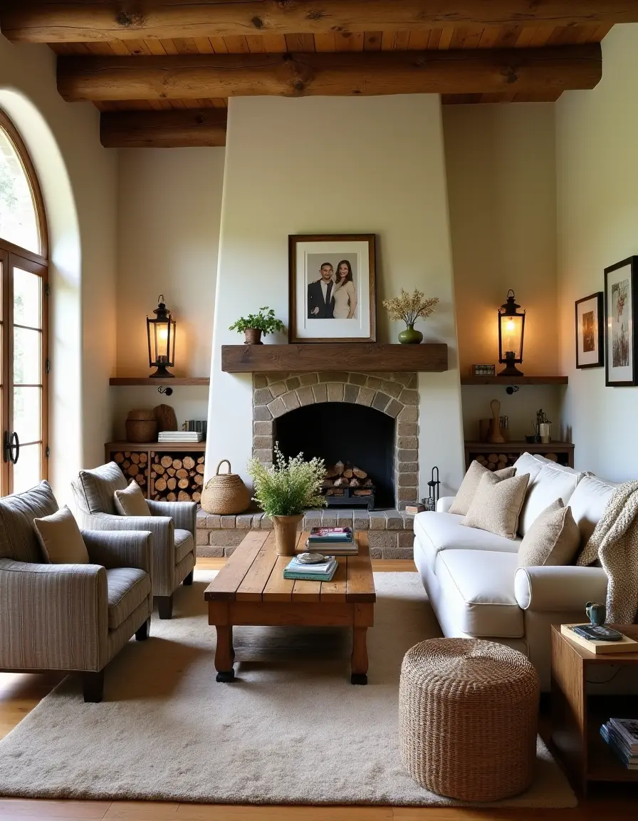 This rustic living room exudes warmth with its exposed wooden beams and a vaulted ceiling, creating an inviting ambiance. The walls, painted in soft cream, beautifully contrast with the natural brown of the reclaimed wood furniture, including a large, weathered coffee table at the center adorned with a vase of fresh wildflowers. A plush, layered texture is achieved through a combination of a thick wool area rug in earthy tones, inviting oversized armchairs upholstered in a muted plaid fabric, and a soft knitted throw draped over a comfortable, low-profile sofa in a light beige hue. To enhance the cozy atmosphere, the room is accentuated with rustic accessories such as a stone fireplace on one side, adorned with stacked firewood and framed family photos, and vintage lanterns that dangle from hooks, casting a soft glow in the evening.