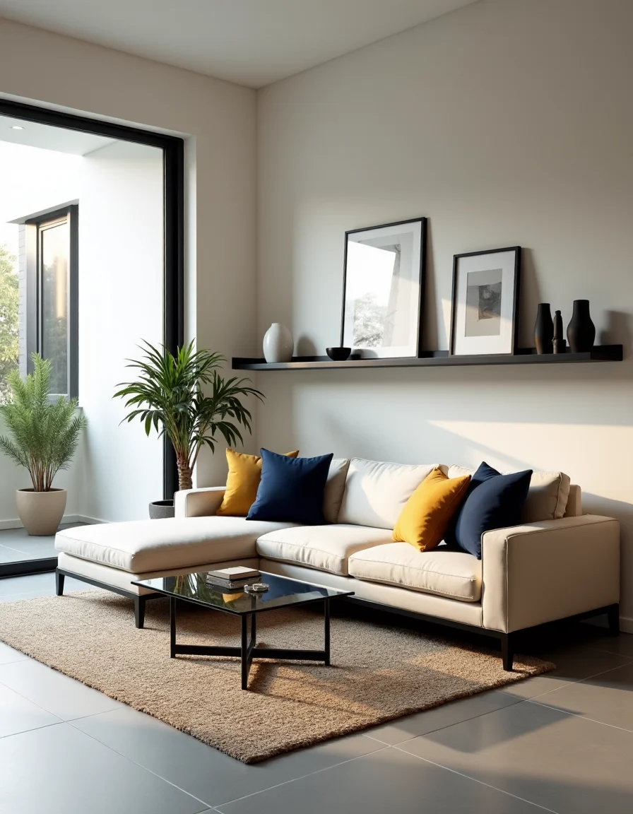 The modern living room boasts a sleek and minimalistic design, featuring a large floor-to-ceiling window that floods the space with natural light, highlighting the cool gray stone flooring. Centered in the room is a low-profile, light beige modular sofa with clean lines, adorned with a few navy-blue and mustard-yellow pillows for a pop of color. A stylish glass coffee table rests on a contemporary woven area rug, balancing the textures and anchoring the seating arrangement. In one corner, a tall indoor plant adds a touch of greenery, while the opposite wall showcases a minimalist floating shelf displaying a few curated decorative items in monochrome colors and a small abstract art piece framed in black. The overall ambiance is bright and inviting, perfect for relaxation and entertaining, characterized by its thoughtfully curated decor and a harmonious blend of materials.