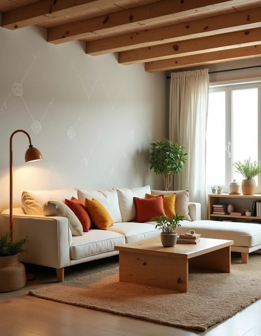 The living room exudes Scandinavian charm with its emphasis on natural materials and a cozy ambiance. A large, light oak coffee table sits at the center, surrounded by plush, creamy white sofas adorned with earthy-toned throw pillows in shades of rust and mustard. On one wall, a soft dove-gray wallpaper featuring delicate geometric patterns compliments the natural texture of exposed wooden beams overhead. A simple woven jute rug grounds the space while a floor lamp with a slender wooden base softly illuminates the room, and potted green plants add a touch of vibrant life beside a minimalist bookshelf, filled with books and handmade ceramic decor. Completing the look, a large window invites ample natural light, showcasing sheer white curtains that drift softly with the breeze and provide an airy feel to the inviting space.