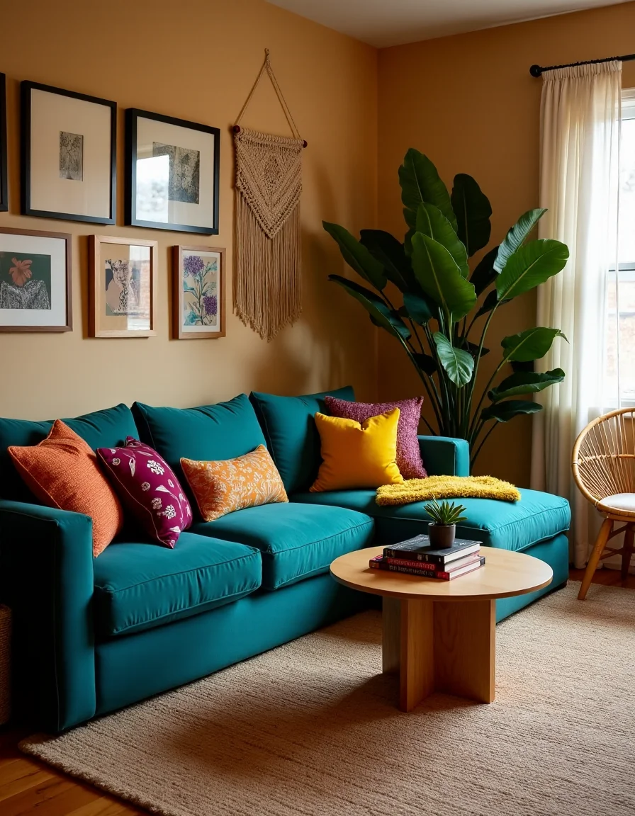 This bohemian living room invites creativity and comfort with its eclectic mix of colors, patterns, and textures. A large, overstuffed, deep teal sectional sofa dominates the space, adorned with an array of mismatched throw pillows in vibrant shades of orange, mustard yellow, and deep purple—some featuring intricate embroidery and others bold geometric designs. In front of the sofa, an antique round wooden coffee table holds a collection of stacked art books with a small, potted succulent on top, adding a playful touch of greenery. The walls are painted a warm, sandy beige, adorned with a variety of framed wall art in different styles, including batik prints and vintage tapestries, while a macramé wall hanging creates an inviting focal point. Lastly, a jute area rug underfoot adds warmth and comfort, and eclectic rattan chairs in one corner invite relaxing conversations, all illuminated by the soft glow of fairy lights woven through a nearby tall leafy plant.